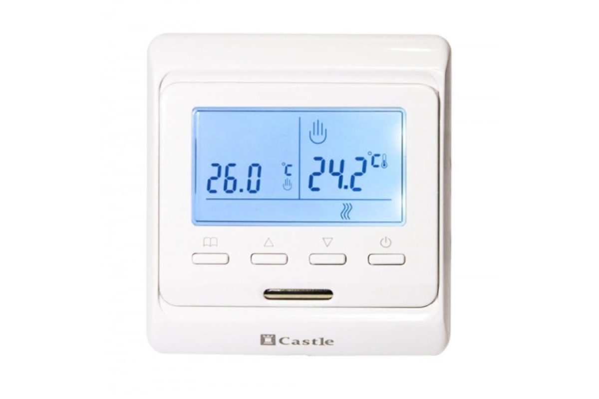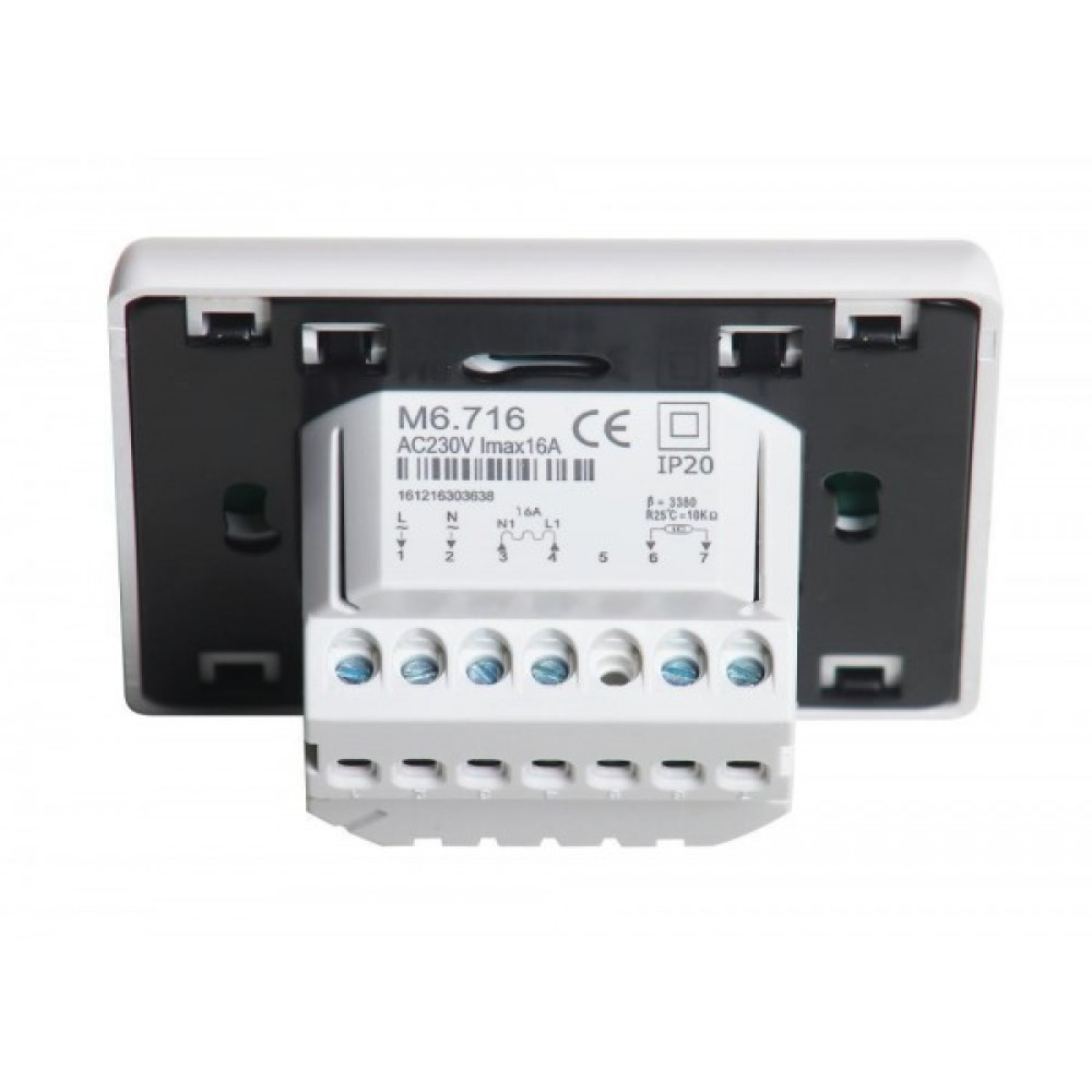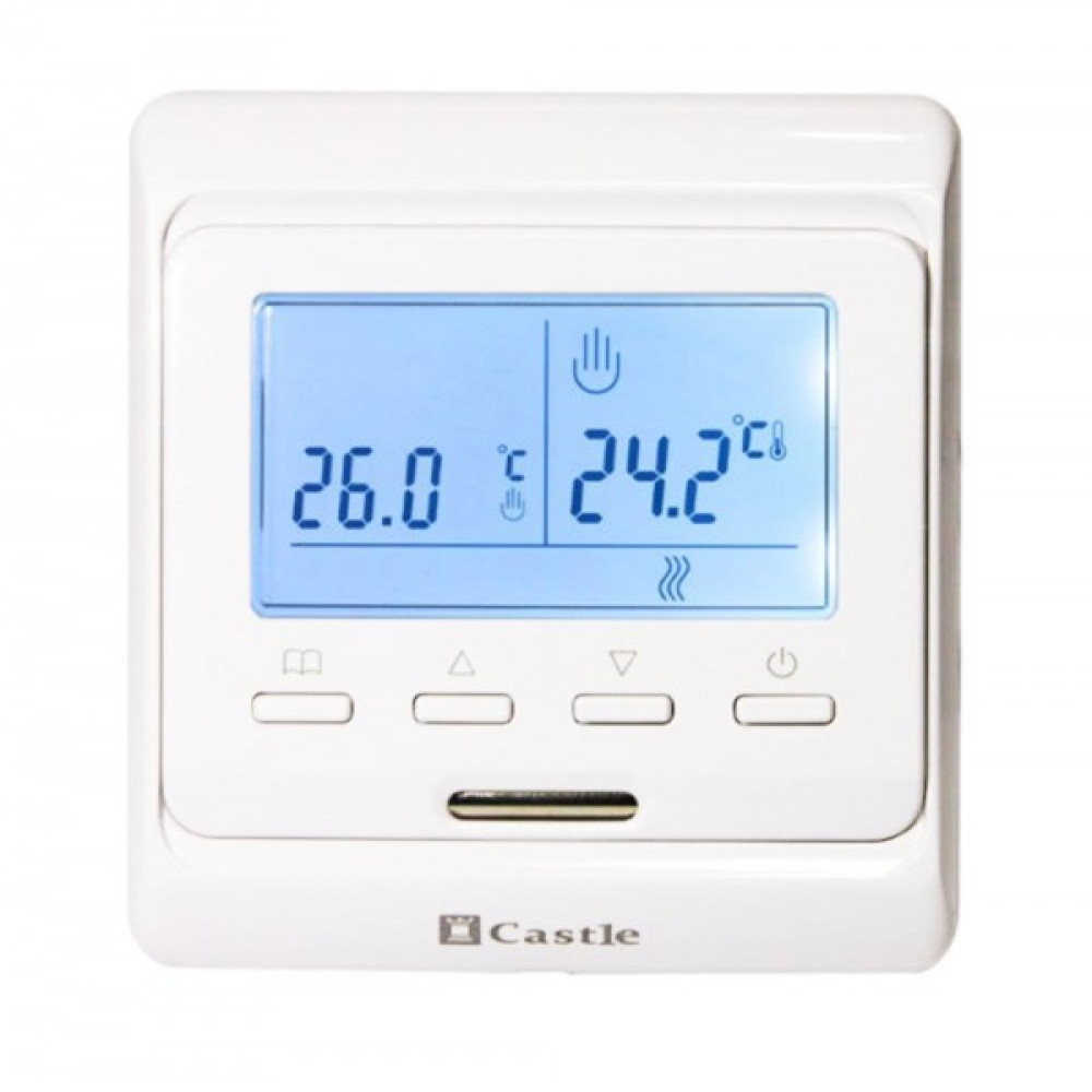 Castle M6.716 - кнопковий програмований терморегулятор. Використовується для керування електричною теплою підлогою всіх типів. Має вбудований датчик температури повітря та виносний датчик температури підлоги. Діапазон вимірювання від +5 до +95 °С