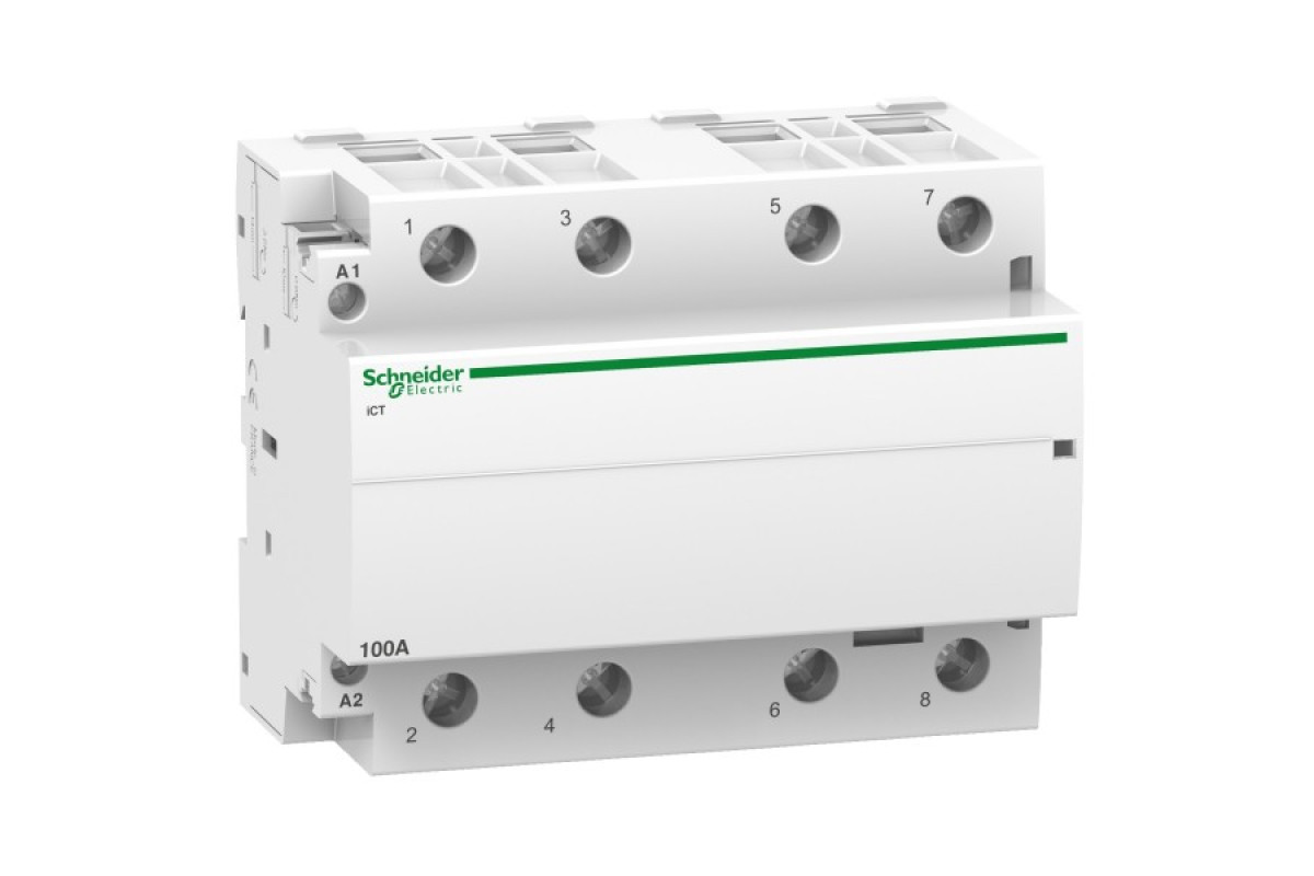 Acti9 iCT це модульний контактор. Це чотирьохполюсний контактор з 4 нормально відкритими контактами. Номінальний струм становить 100 А для AC-7a. Номінальна робоча напруга Ue становить 400 В змінного струму. Напруга керування Uc становить від 220 до 240 В змінного струму. Цей пристрій можна використовувати для схем керування систем опалення, вентиляції та кондиціонування. Відповідає стандарту МЕК 61095.