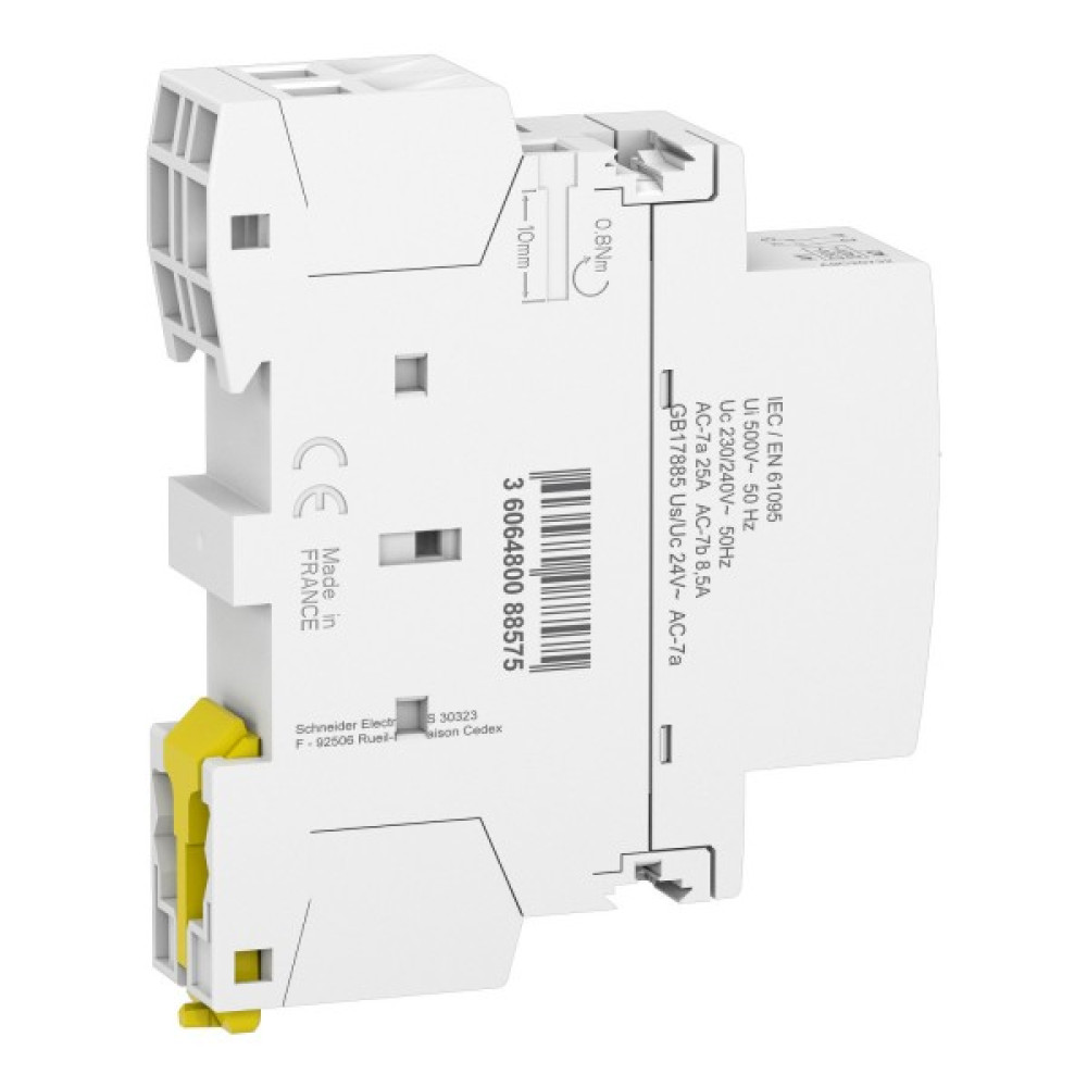 Acti9 iCT це модульний контактор. Це двохполюсний контактор з 2 нормально відкритими контактами. Номінальний струм становить 25 A для AC-7a та 8,5 A для AC-7b. Номінальна робоча напруга Ue становить 250 В змінного струму. Напруга керування Uc становить 230-240 В змінного струму. Контактор призначенний для організації електричних схем керування. Можливі застосування: дистанційне перемикання освітлювальних навантажень, невеликих двигунів (вентиляторів, змішувачів) або систем опалення, вентиляції та кондиціонування. Відповідає стандарту МЕК 61095.