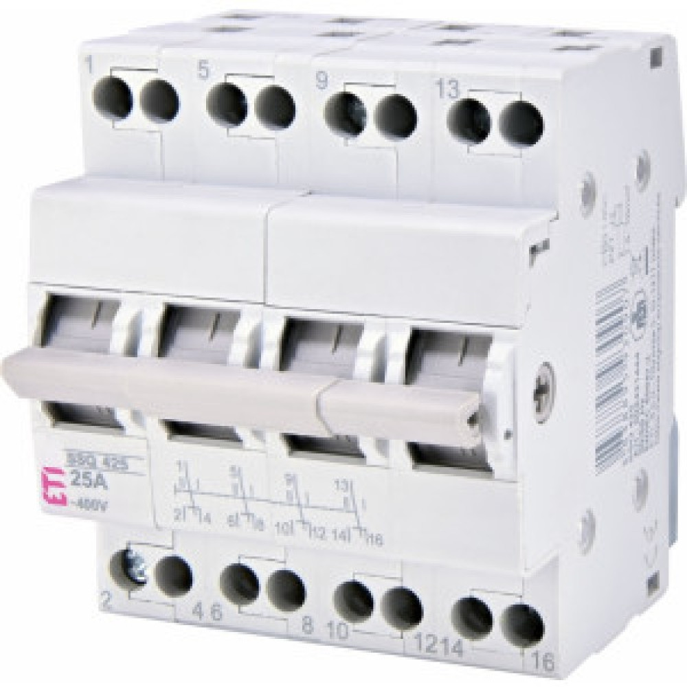 Перемикач SSQ 425, 4 полюси, 25 ампер. Ширина чотири стандартні модулі. Перетин провідників: багатожильний 1,5-10мм, одножильний 1,5-16мм.