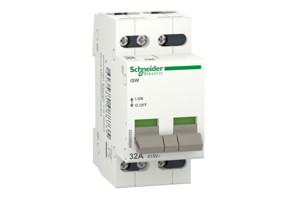 Acti9 iSW це модульний вимикач навантаження. Це 3-х полюсний вимикач з номінальним струмом 32A та робочою напругою 415 В змінного струму. Електрична зносостійкість 30 000 циклів, механічна зносостійкість 300 000 циклів. Робоча температура від -20°C до +50°C. Температура зберігання від -40°C до +70°C. Ступінь захисту IP20 і IP40 при встановленні в щиті. Призначений для встановлення на DIN-рейку. Його ширина складає 2 модулі по 4 мм. Розміри: (Ш) 36 мм x (В) 77 мм x (Г) 70 мм. Відповідає стандарту МЕК 60669-2-4.