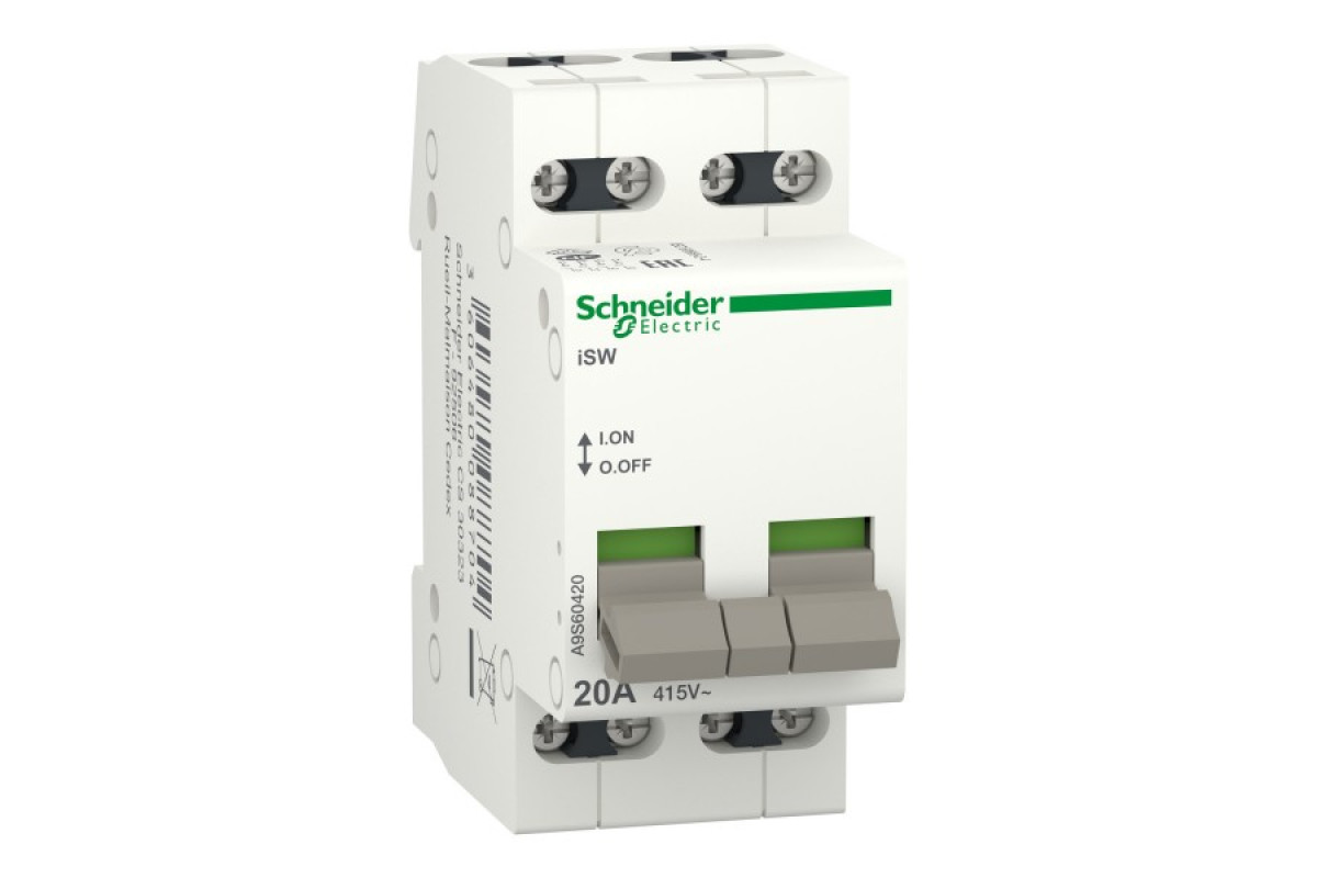 Acti9 iSW це модульний вимикач навантаження. Це чотрьохполюсний вимикач з номінальним струмом 20A та робочою напругою 415 В змінного струму. Електрична зносостійкість 30 000 циклів, механічна зносостійкість 300 000 циклів. Робоча температура від -20°C до +50°C. Температура зберігання від -40°C до +70°C. Ступінь захисту IP20 і IP40 при встановленні в щиті. Призначений для встановлення на DIN-рейку. Його ширина складає 4 модулі по 9 мм. Розміри: (Ш) 36 мм x (В) 77 мм x (Г) 70 мм. Відповідає стандарту МЕК 60669-2-4.