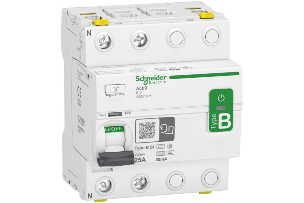 Acti9 iID це модульний вимикач диференційного струму (ВДС) для електромобілей. Це 2-х полюсний ВДС з номінальним струмом 25A, класом захисту B-EV і чутливістю до витоку на землю 30 мА. Він призначений для захисту людини від ураження електричним струмом через прямий або непрямий контакт, а також від пожежі. Механічний індикатор VisiTrip сигналізує про спрацювання ВДС, чим скорочує час виявлення проблеми та її вирішення. Зелена смужка VisiSafe гарантує фізичне розмикання контактів, що дозволяє безпечно проводити технічне обслуговування. Відповідає стандартам МЕК 61008-2-1 і МЕК 62423.