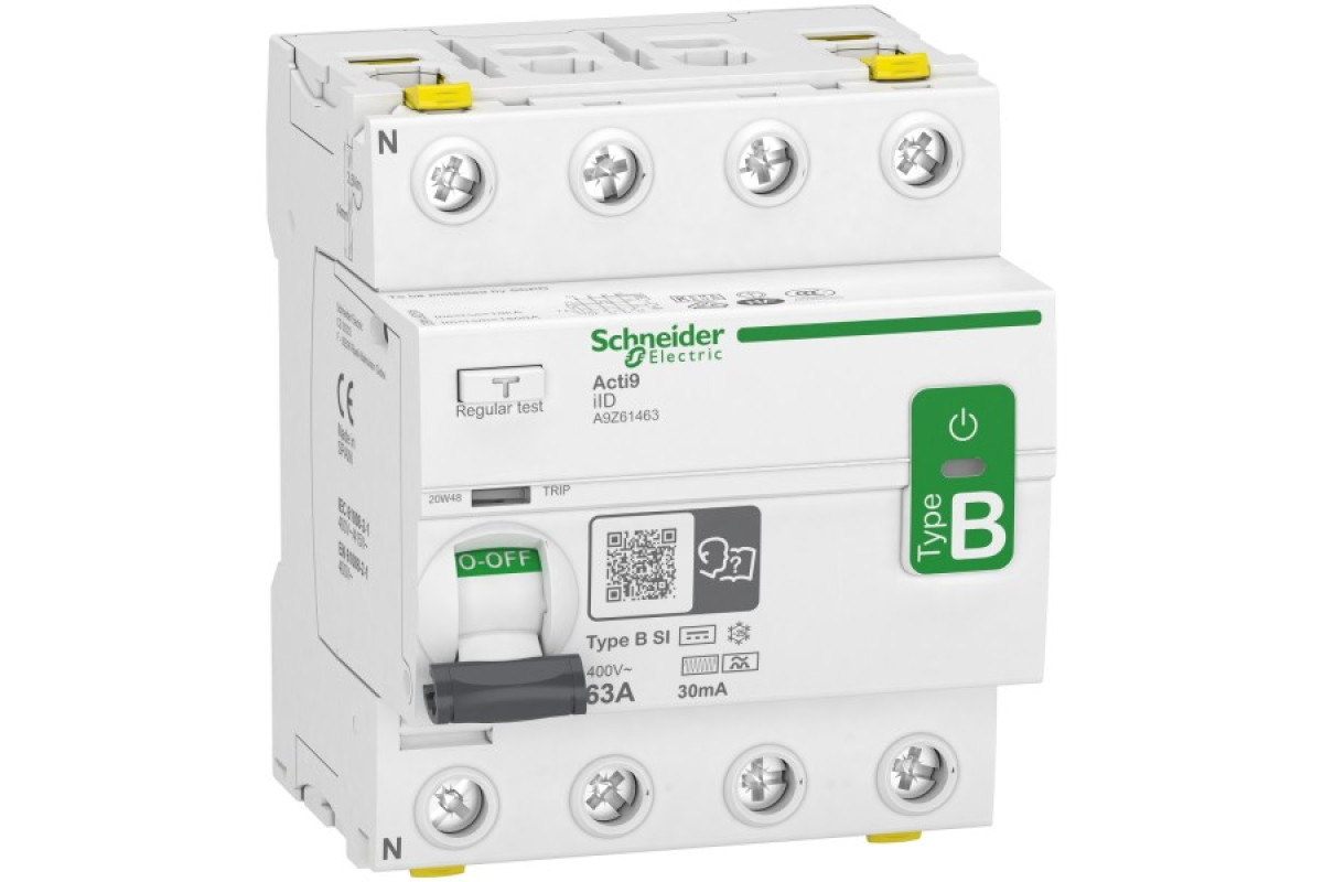 Acti9 iID - це модульний вимикач диференційного струму (ВДС). Це 4-хполюсний вимикач з номінальним струмом 63 А, чутливістю 30 мА, типу BС. Він призначений для захисту людини від ураження електричним струмом через прямий або непрямий контакт, а також від пожежі. Механічний індикатор VisiTrip сигналізує про спрацювання ВДС, чим скорочує час виявлення проблеми та її вирішення. Зелена смужка VisiSafe гарантує фізичне розмикання контактів, що дозволяє безпечно проводити технічне обслуговування. Відповідає стандарту МЕК 61008-1, МЕК 62423. Номінальна відключаюча здатність (Im/IΔm) становить 1500 А.