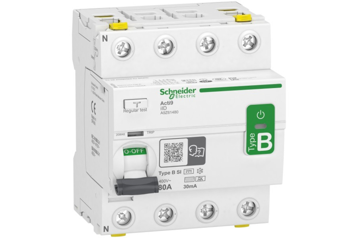 Acti9 iID - це модульний вимикач диференційного струму (ВДС). Це 4-хполюсний вимикач з номінальним струмом 80 А, чутливістю 30 мА, типу BС. Він призначений для захисту людини від ураження електричним струмом через прямий або непрямий контакт, а також від пожежі. Механічний індикатор VisiTrip сигналізує про спрацювання ВДС, чим скорочує час виявлення проблеми та її вирішення. Зелена смужка VisiSafe гарантує фізичне розмикання контактів, що дозволяє безпечно проводити технічне обслуговування. Відповідає стандарту МЕК 61008-1, МЕК 62423. Номінальна відключаюча здатність (Im/IΔm) становить 1500 А.