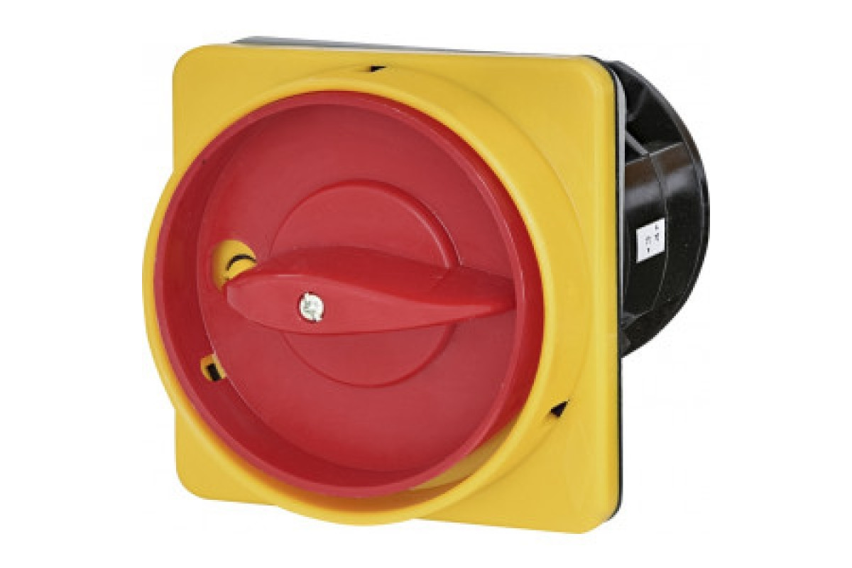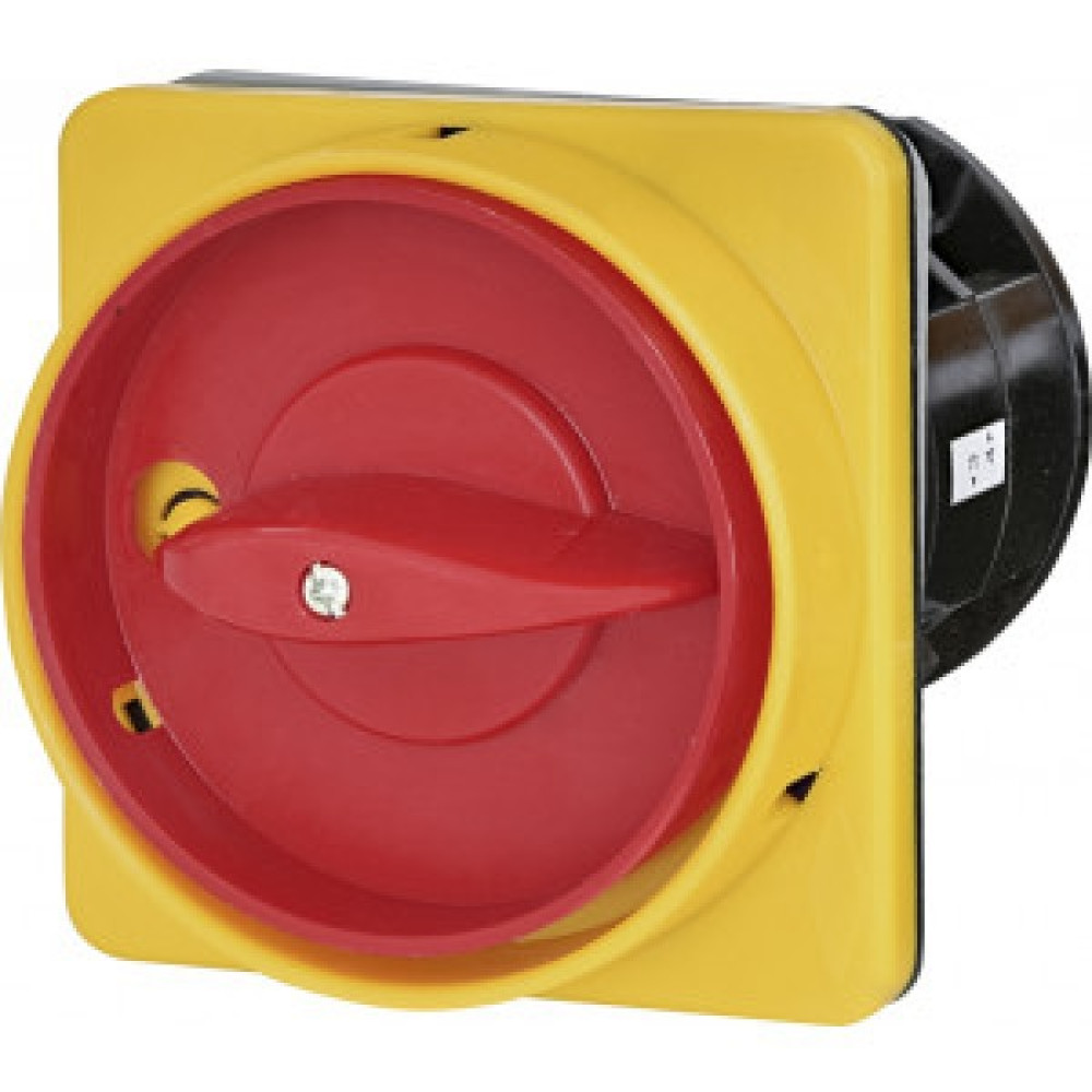 Пакетний вимикач аварійного типу CS 100 10 U LK. Встановлення на дверцята електричного щита. Струм - 100А. Триполюсний. Керування - поворот з можливістю блокування замком в положенні 0. Схема вимкнути - ввімкнути (0-1). Колір - Червоно-жовтий.