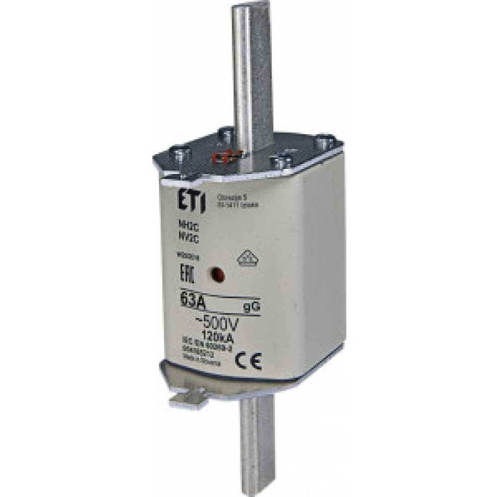 Запобіжники серії NH, 63A, 500V, характеристики gL/gG (загального призначення), використовуються для захисту від короткого замикання та перенапруги. На запобіжнику встановлений візуальний індикатор спрацьовування. Габарит 2. Більше інформації в технічному описі.
