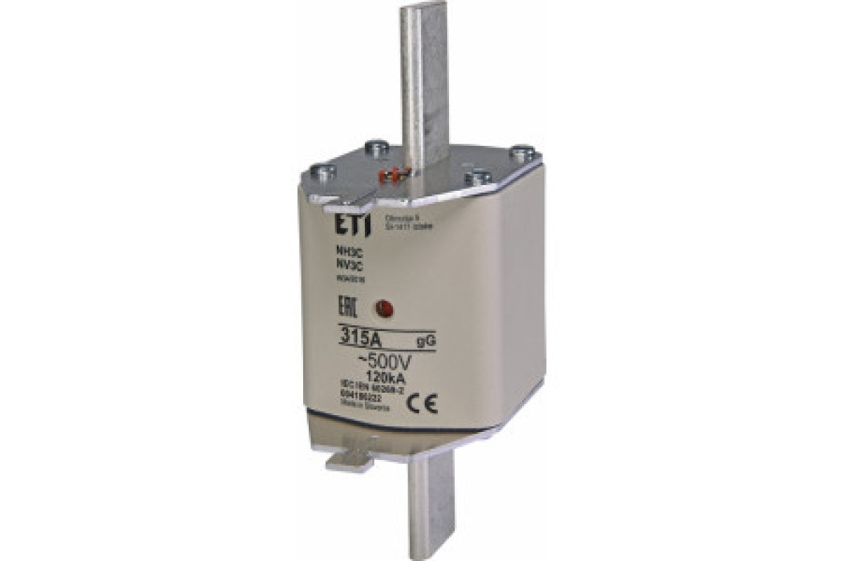 Запобіжники серії NH, 315A, 500V, характеристики gL/gG (загального призначення), використовуються для захисту від короткого замикання та перенапруги. На запобіжнику встановлений візуальний індикатор спрацьовування. Габарит 3. Більше інформації в технічному описі.