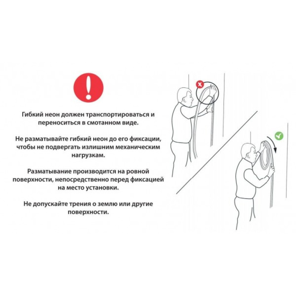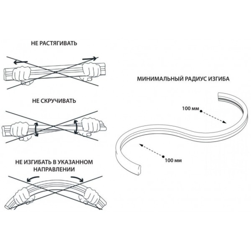 Уникайте згинання під гострим кутом. Не допускається тривале підключення у змотанному стані. Слід також уникати створення фігур з радіусом менше 10 см. Може використовуватися як усередині приміщень, так і для вуличного освітлення.