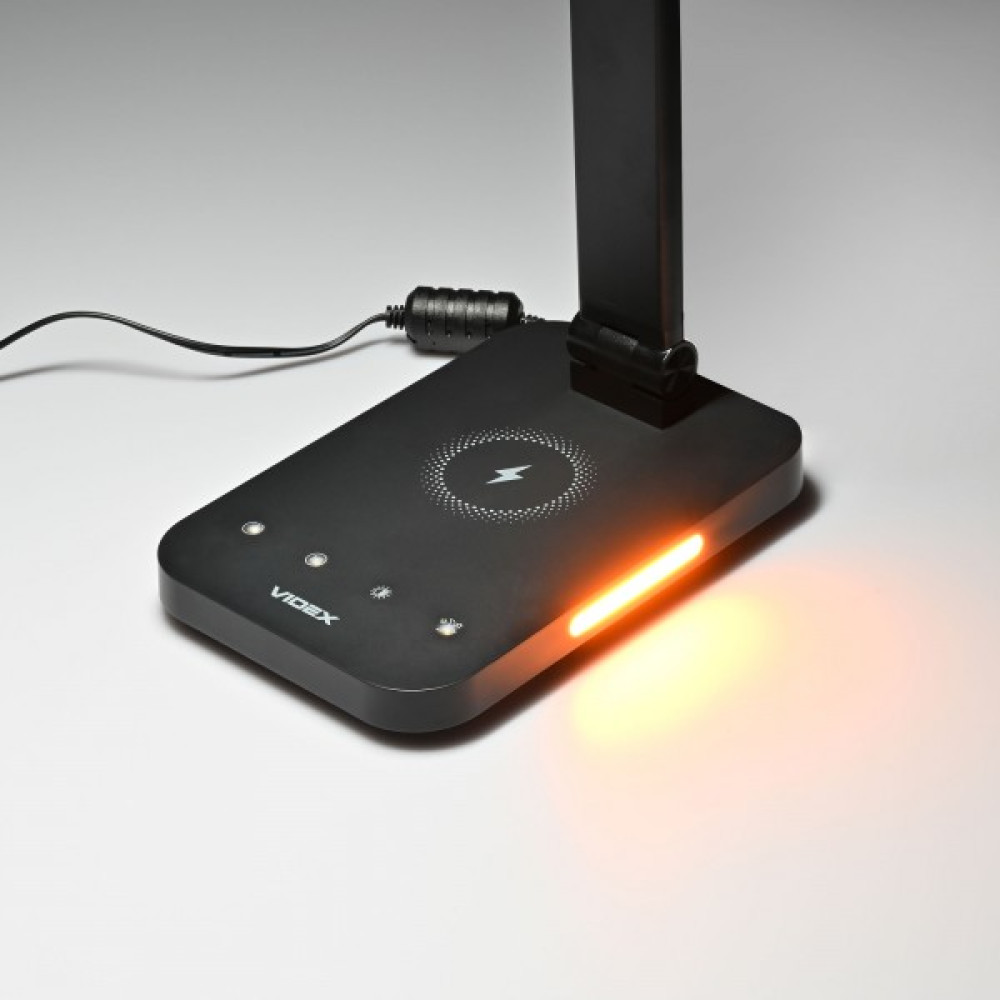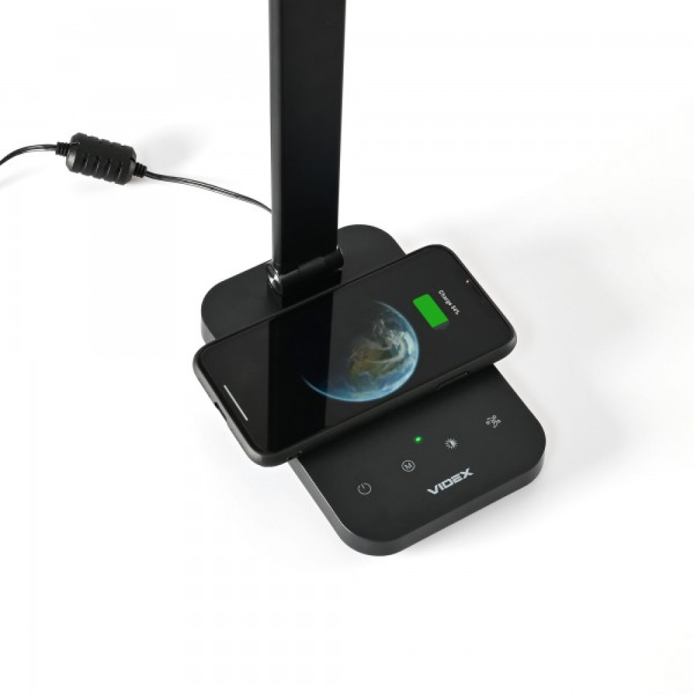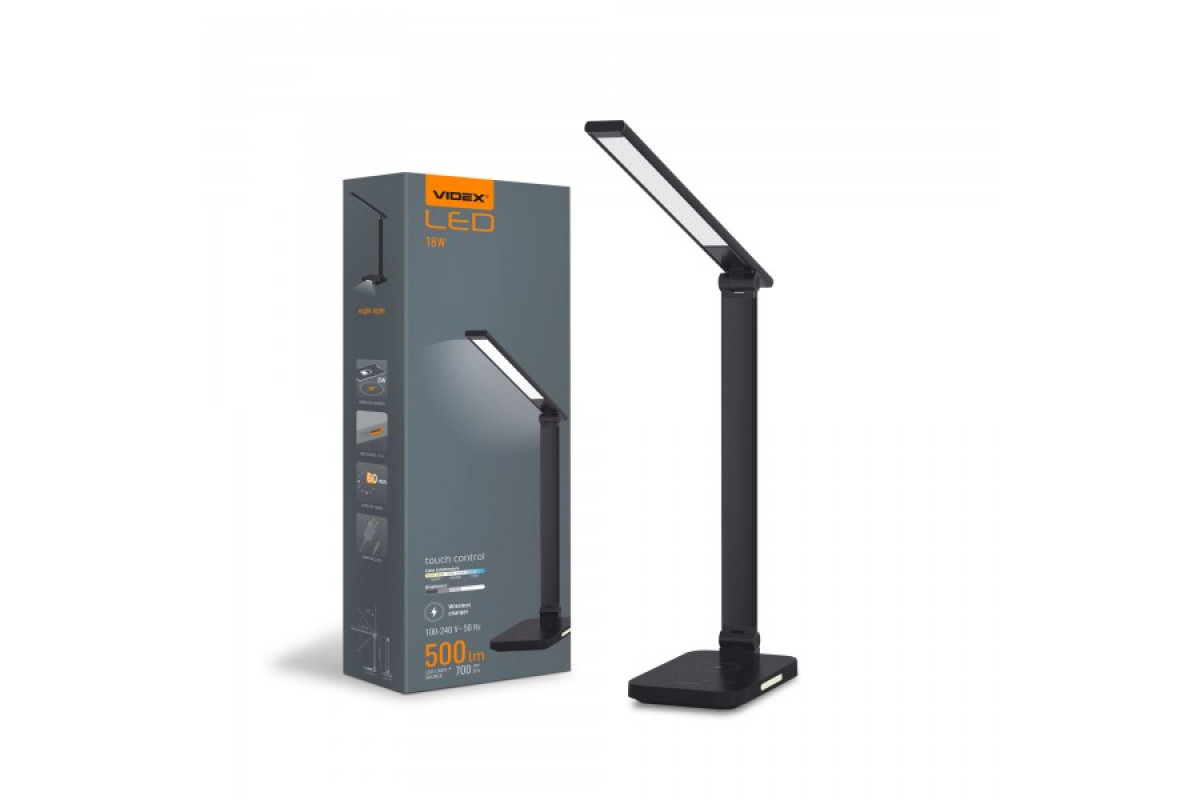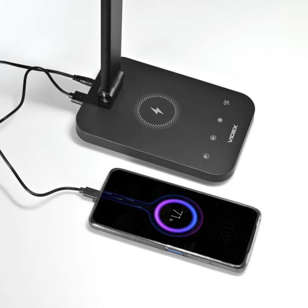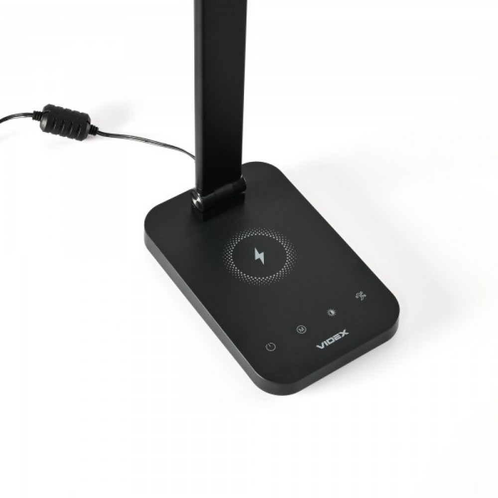 LED лампа настiльна з бездротовою зарядкою VIDEX VL-TF17B 18W 120 градусів Ra > 80 18 Вт, 500Лм блоком живлення 12В/1.5А має один USB-вихід бездротова зарядка потужністю 8 Вт 30 000 годин від 3000K до 6500K Нічне світло 1800K