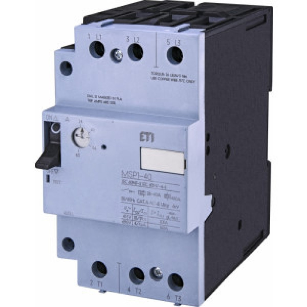 ETI MSP - бюджетна серія автоматичних вимикачів захисту з фіксованою настройкою електромагнітного захисту. Автоматичні вимикачі захисту електродвигунів серії MSP від європейського виробника ETI застосовуються для пуску двигунів та їх захисту від струмів коротких замикань. Крім того, автомати цієї лінійки мають регулювання захисту від перевантажень. Моделі MSP0 (0,6 - 25A) та MSP1 (22 - 52A) розраховані на потужність двигуна 0,12 - 22кВт.