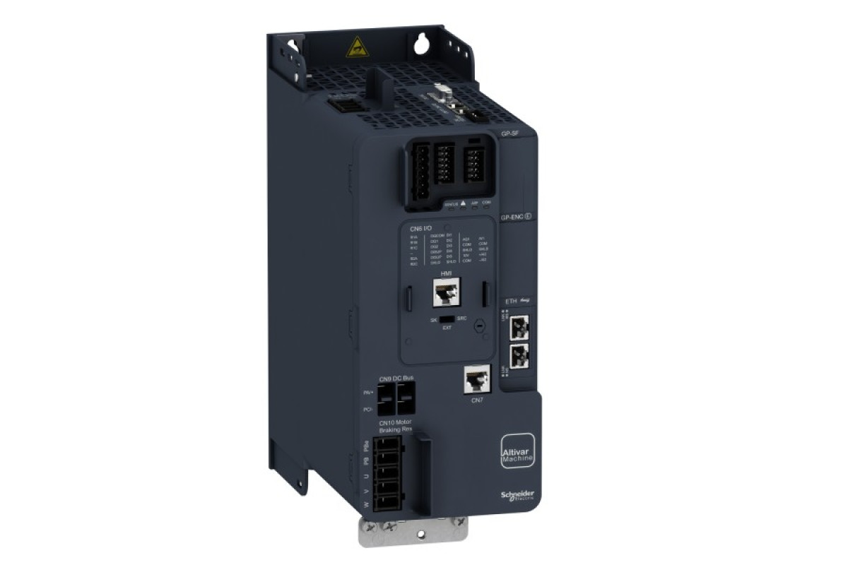 Цей частотний перетворювач Altivar 340 може живити 3-фазні синхронні та асинхронні двигуни з розімкненим або замкненим контуром керування. Приводи Altivar Machine ATV340 стандартно мають режим роботи Важкий. Він працює з номінальною потужністю до 7,5 кВт / 10 кінських сил і номінальною напругою від 380 В до 480 В змінного струму. ATV340 був розроблений, щоб задовольнити потреби застосування в суворих середовищах, таких як вібрація, поодинокі ударні навантаження та токонепровідний пил, і де потрібна висока термостійкість до 60 °C. Цей продукт стандартно інтегрує протоколи зв’язку послідовної лінії Modbus. Цей привод має вбудований багатопротокольний Ethernet, він складається з комунікаційних інтерфейсів Ethernet IP і Modbus TCP. Він важить 3 кг і має такі розміри: 110 мм в ширину, 270 мм у висоту, 234 мм у глибину. ATV340 містить функції та особливості, придатні для найпоширеніших застосувань, включаючи пакування, транспортування матеріалів, обробку матеріалів, підйомні механізми. Він відповідає міжнародним стандартам IEC/EN 61800-5-1 і IEC/EN 61800-3 (захищеність від електромагнітної сумісності, електромагнітних випромінювань), IEC 60721-3, IEC 61508, IEC 13849-1. Він також має сертифікати CE, UL, CSA та TÜV. Він призначений для монтажу у вертикальному положенні (+/- 10 °) на панелі завдяки 4 отворам для кріплення. Його повністю інтегровано в EcoStruxure Machine від Schneider Electric через DTM. Можна налаштовувати, контролювати та діагностувати приводи ATV340 безпосередньо в програмному забезпеченні SoMachine та SoMove за допомогою того самого блоку програмного забезпечення (DTM). Він екологічно чистий і відповідає таким директивам, як RoHS щодо захисту навколишнього середовища.