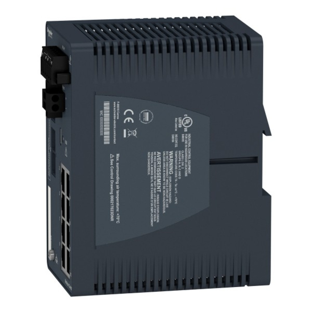 Продукт є частиною лінійки Modicon Networking, пропозиції керованого комутатора Modicon Extended. Це керований комутатор Ethernet TCP/IP, який оснащений 8 портами передачі даних для мідного кабелю та 2 портами для багатомодового оптоволокна. Пристрій забезпечує просте та комплексне підключення для кількох пристроїв Ethernet, керування мережею, покращену кібербезпеку та розширені функції комутації. Пристрій працює при споживанні електроенергії 8 Вт і номінальній напрузі від 12 до 24 В постійного струму. Він оснащений 6-контактним знімним роз’ємом (блок живлення) для електричного підключення. Його розміри становлять 73 мм (ширина) x 143 мм (висота) x 118 мм (глибина) і важить 0,57 кг. Він має екрановані роз’єми, які підходять для середніх, ізольованих мереж, систем із середнім мережевим трафіком та середнім рівнем складності. Він сертифікований CE, UL, RCM, DNV, Lloyds, BV, ATEX і відповідає стандартам UL 61010, МЕК 61131 і МЕК 62368-1. Пристрій призначений для встановлення на 35-мм симетричну DIN-рейку. Він забезпечує низьке енергоспоживання та компактні розміри. Лінійка Modicon Networking пропонує розумний і гнучкий спосіб інтеграції рішень Ethernet у вашу роботу, від рівня пристрою до мережі керування та вашої корпоративної мережі.