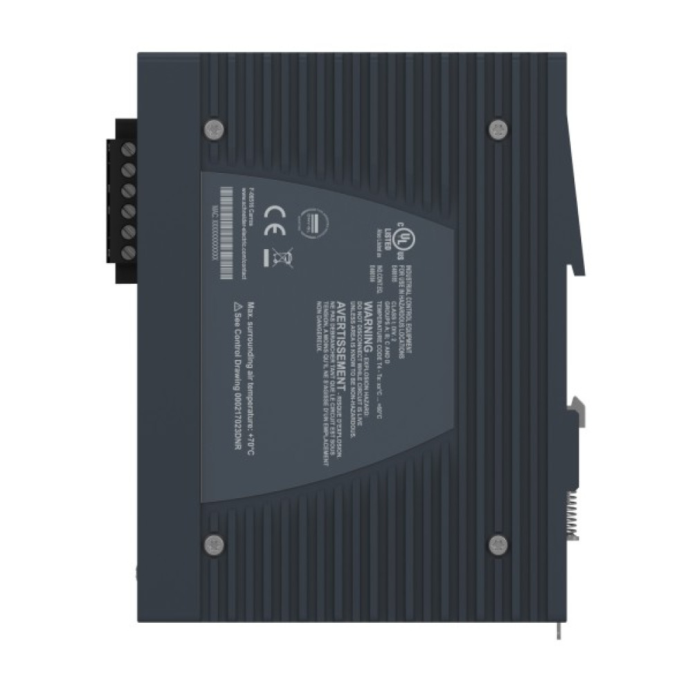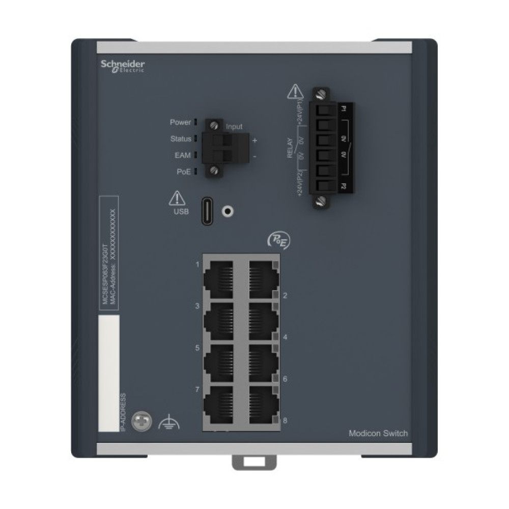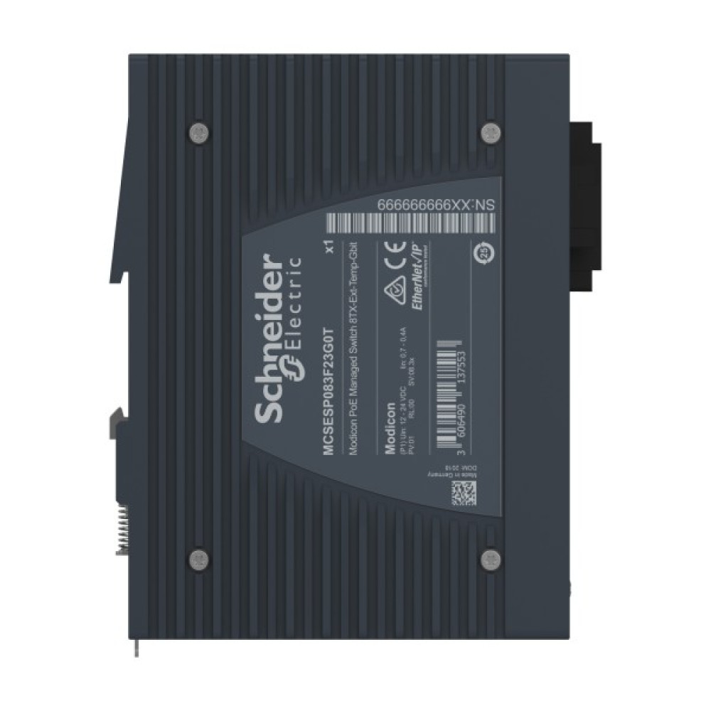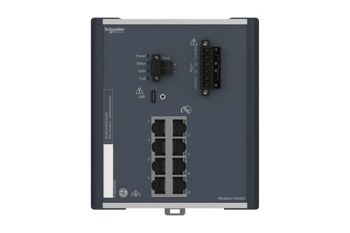 Продукт є частиною лінійки Modicon Networking, пропозиції керованого комутатора Modicon PoE. Це керований комутатор Ethernet TCP/IP, який оснащений 8 портами передачі даних для мідного кабелю. Робоча температура пристрою від -40 до 70°C. На цьому комутаторі доступна функція живлення через Ethernet. Пристрій забезпечує просте та комплексне підключення для кількох пристроїв Ethernet, керування мережею, покращену кібербезпеку та розширені функції комутації. Пристрій працює при споживанні електроенергії 106 Вт і номінальній напрузі 24 В постійного струму. Він оснащений 6-контактним знімним роз’ємом (блок живлення) для електричного підключення. Його розміри становлять 125 мм (ширина) x 138 мм (висота) x 111 мм (глибина) і важить 1,40 кг. Він дозволяє подавати струм живлення на пристрій, наприклад IP-камеру, через кабель з 4 витих пар, які одночасно використовуються як звязок Ethernet. Він сертифікований CE, UL, RCM, EAC, UKCA, DNV і відповідає стандартам UL 61010, МЕК 61131 і МЕК 62368-1. Пристрій призначений для встановлення на 35-мм симетричну DIN-рейку. Він забезпечує низьке енергоспоживання та компактні розміри. Лінійка Modicon Networking пропонує розумний і гнучкий спосіб інтеграції рішень Ethernet у вашу роботу, від рівня пристрою до мережі керування та вашої корпоративної мережі.