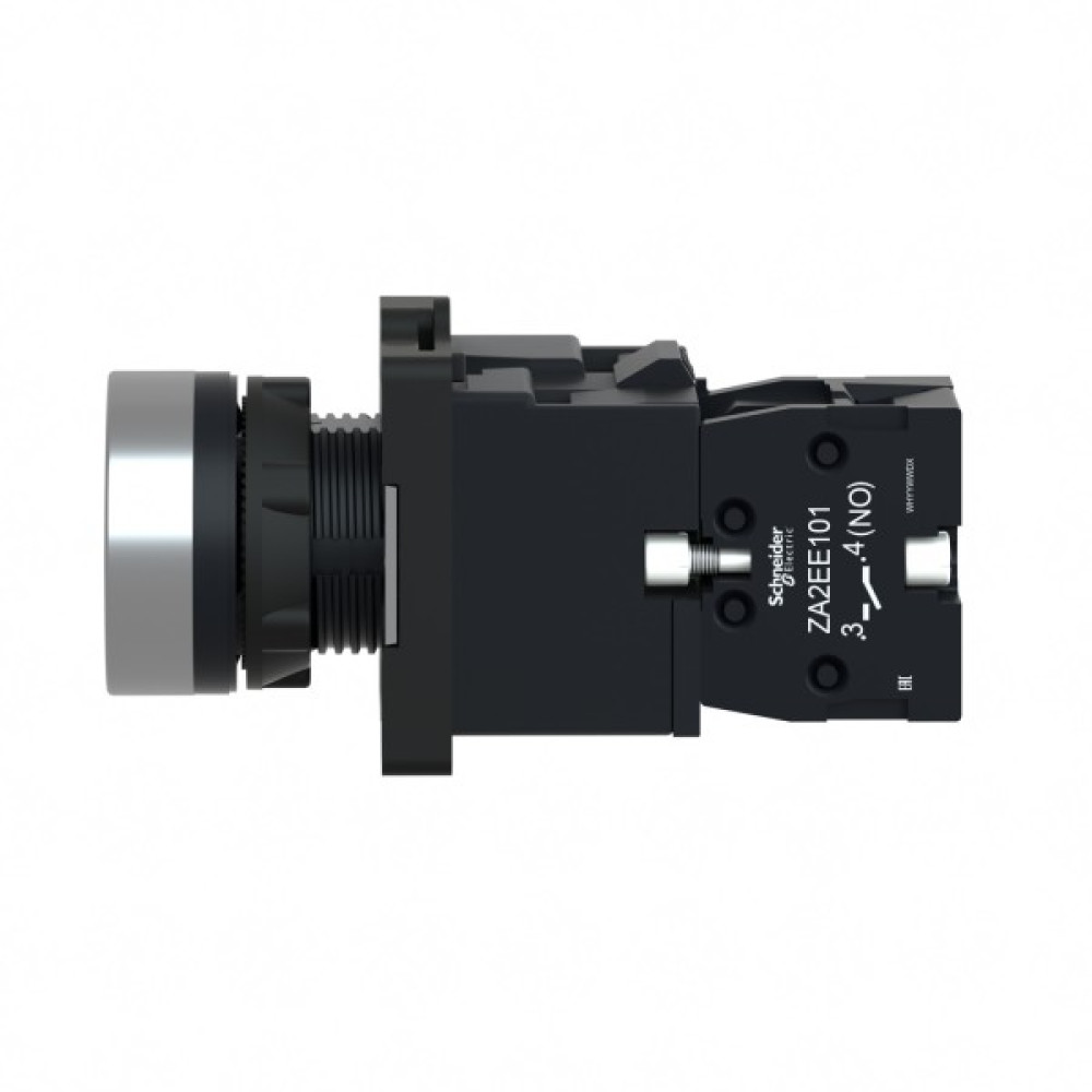 Ця кнопка з підсвічуванням і вбудованим світлодіодом забезпечує ергономічний і візуальний інтерфейс для керування машинами. Він має 1 NO контакт з повільним розривом. Ця кнопка має номінал 24 В AC/DC. Це пластикова кнопка з металевим кільцевим дизайном.