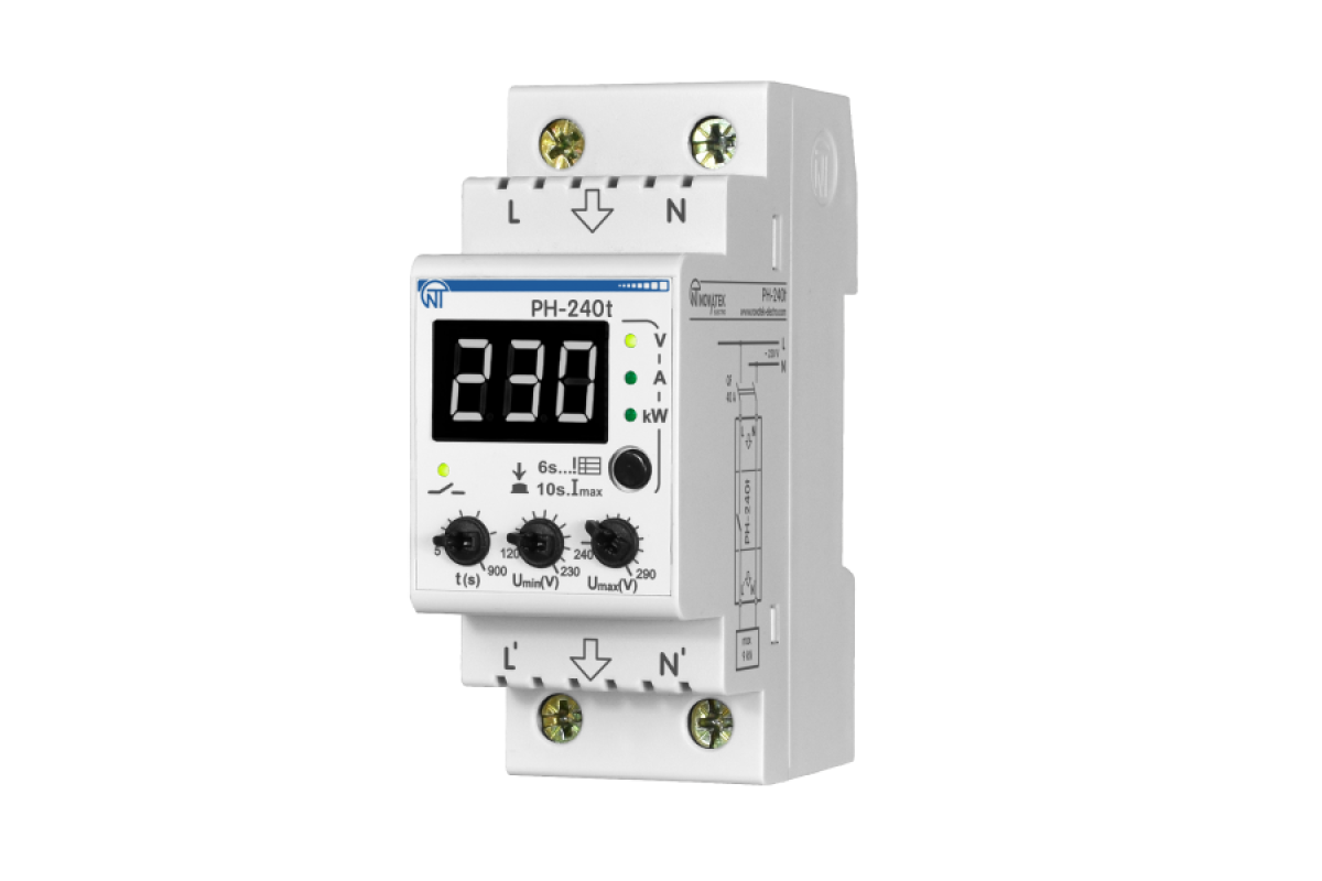 Виріб розраховане на струм навантаження до40 А.РН-240t відображає діюче значення напруги в мережі і стан вихідних контактів (стан навантаження).РН-240t має захист від перегріву через перевищення номінального струму навантаження.РН-240t вимірює і виводить на дисплей споживаний навантаженням струм, активну і реактивну потужність і відключає навантаження при перевищенні заданих порогів по струму і потужності.