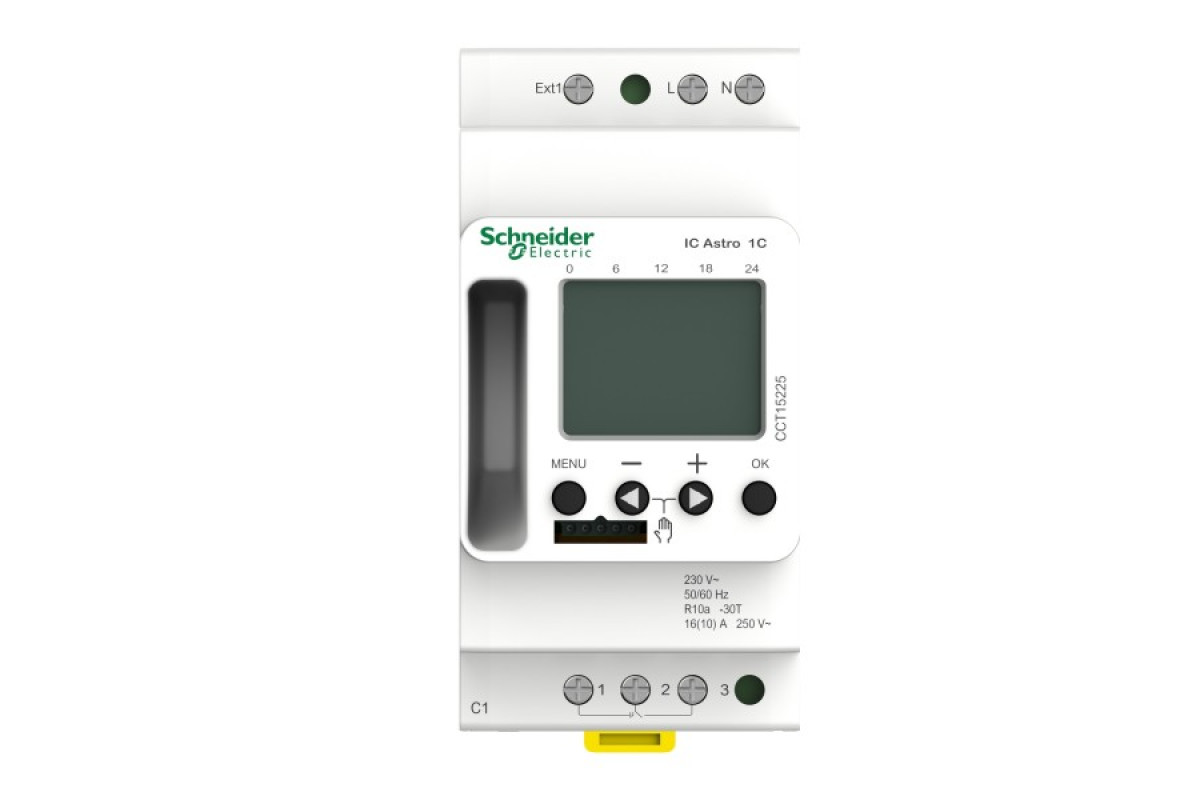 Астрономічний програмований сутінковий вимикач IC Astro SMART. Ширина 45 мм (5 модулів по 9 мм). Для запуску та зупинки електричного навантаження відповідно до часу сходу та заходу сонця. Немає необхідності використовувати датчик яскравості, оскільки час сходу та заходу сонця розраховується автоматично відповідно до географічного розташування. Інтегрований таймер із циклом перемикання 7 днів (щотижня). 84 операції перемикання. Автономна робота при відключенні мережі, резерв батареї: 10 років. Можливе ручне та дистанційне перевизначення. 1 канальний вихід. Програмування можна виконати за допомогою ключа пам’яті та програмного забезпечення через ПК. Тримач посібника користувача з лівого боку виробу дозволяє легко дістати документ.
