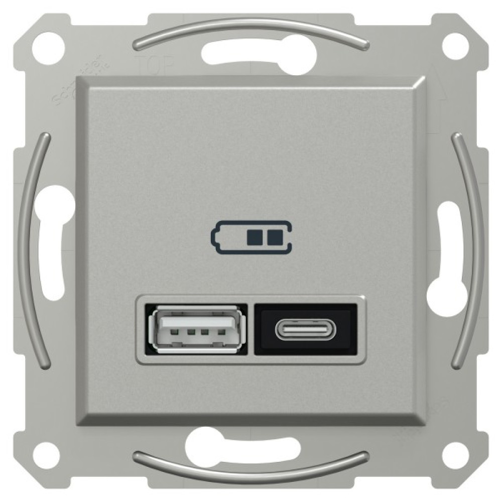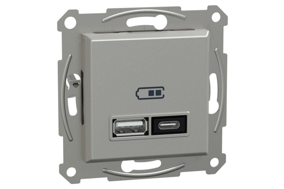 Скористайтеся рішенням для швидкого заряджання від Schneider Electric із зарядним пристроєм Asfora USB-A та USB-C PD PPS потужністю 21 Вт в алюмінієвого кольору. Цей пристрій призначений для будь-якого внутрішнього середовища та живлення від електромережі. Розетка оснащена передовою технологією заряджання USB-C Power Delivery Programmable Power Supply (PD PPS), що підвищує продуктивність заряджання акумулятора. Вона розумно вибирає найбільшу потужність, яку може витримати пристрій, і підтримує всі новітні технології заряджання акумулятора.