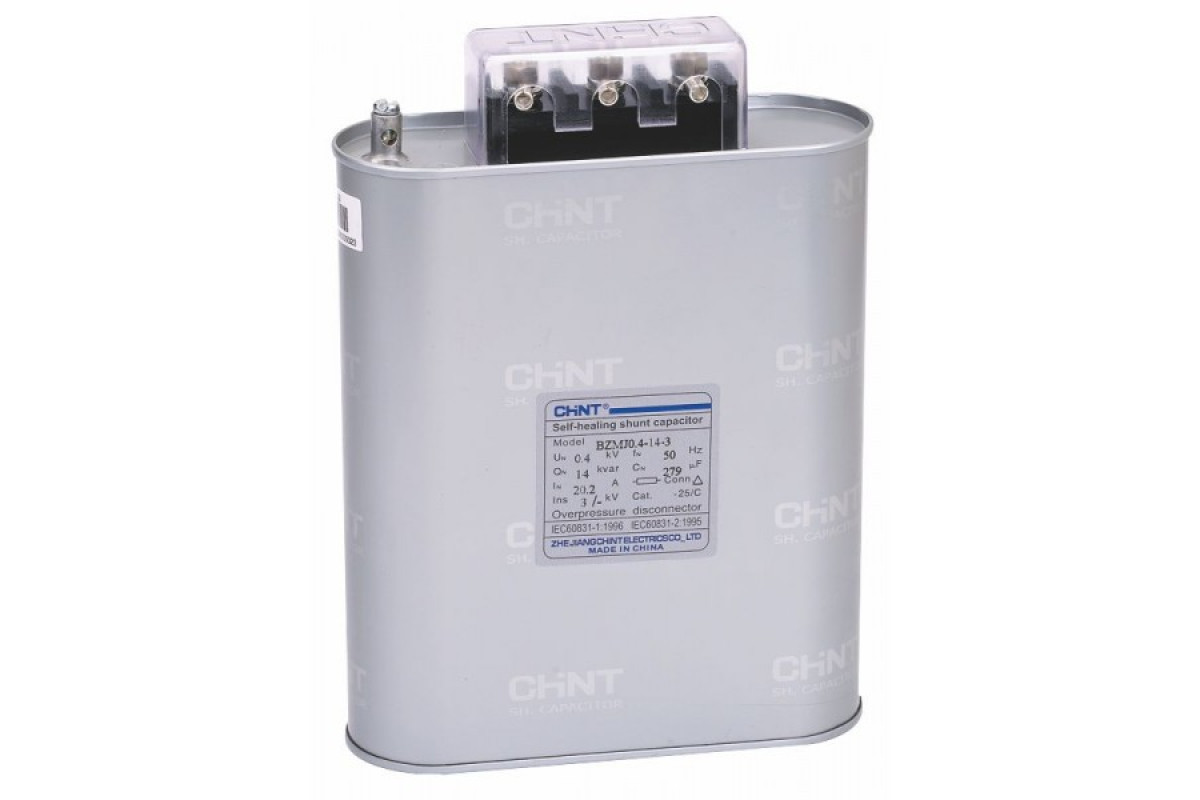 Самовосстанавливающиеся шунтирующие трехфазные конденсаторы CHINT BZMJ-0.45-50-3 АС450В, 50кВАр используются в устройствах компенсации реактивной мощности и предназначены для компенсации коэффициента мощности индуктивных потребителей в сетях переменного тока. Технические характеристики трехфазных шунтирующих конденсаторов с жидким диэлектриком CHINT BZMJ-0.45-50-3 АС450В, 50кВАр.