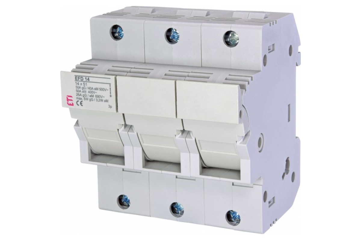 Для данной модели прекрасно подходят предохранители СН, от компании ЕТІ. Продукция производимая компанией ETI Словения, сертифицирована в Украине и поставляется с официальной гарантией производителя. Держатель разъединитель EFD 14x51, 3 полюса, для цилиндрических керамических предохранителей переменного тока. Размер предохранителя 14х51, номинальное напряжение 690V AC, установка на дин-рейку, без индикации
