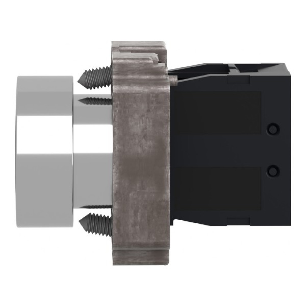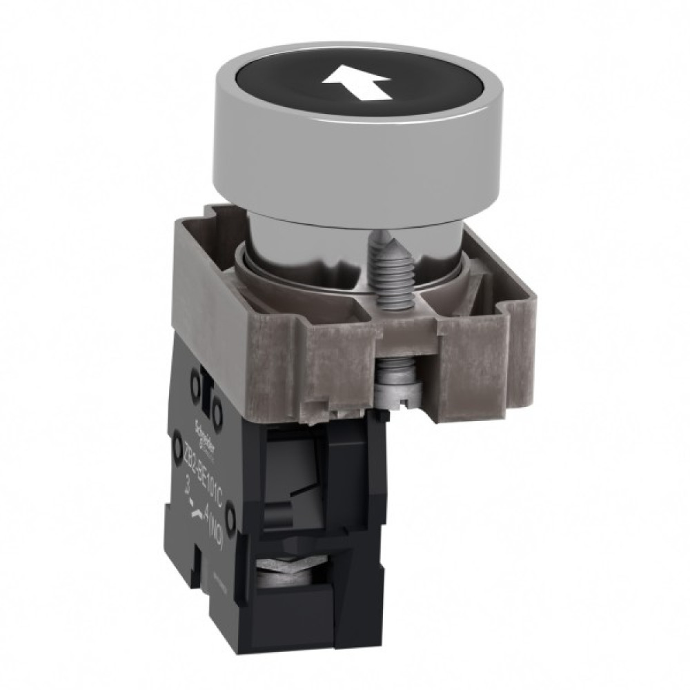 Модульная черная кнопка Easy Harmony XB2 работает с помощью пружинного механизма возврата. Он обозначен символом "стрелка вверх". Корпус/фиксирующий хомут предварительно смонтирован с контактным блоком NO. Он имеет металлический безель, металлическое фиксирующее основание и металлические винты для ударостойкости и вибрации.