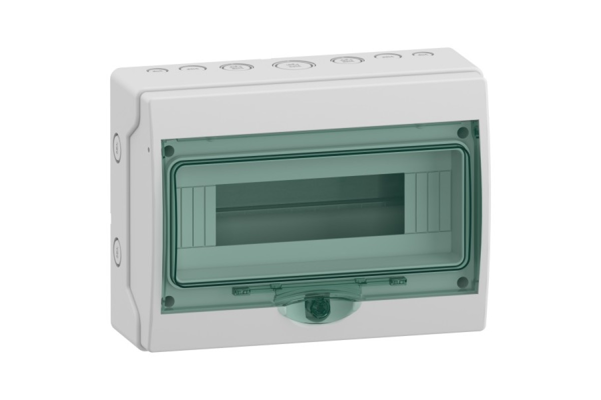 Водонепроникний навісний міні-щит Mureva, для монтажу модульних пристроїв. Щит містить 1 ряд на 12 модулів по 18 мм. Може вмістити всі типи модульних розподільних пристроїв. Щит призначений для внутрішнього та зовнішнього встановлення. Ступінь захисту IP65. Містить прозорі зелені двері. Колір щита світло-сірий (RAL 7035). Призначений для встановлення в житлових будівлях та промисловості. Кабелі можна вводити через верхню або нижню частину щита через 7 попередньо підготовлених місць для підведення. Оснащений задньою пластиною, кришкою з виїмкою та DIN-рейкою. На задній частині щита можна встановити 2 клемні блоки, кожні з яких мають 8 виходів (4x10 мм² + 4x16 мм²). Набір для маркування входить у комплект поставки. Клас електроізоляції II (подвійна ізоляція). Категорія перенапруги клас II. Розсіювана потужність 19 Вт. Номінальний струм (In) 63А. Продукт повністю відповідає стандарту МЕК 61439-3. Розміри: (Ш) 267 мм x (В) 200 мм x (Г) 112 мм. Виріб зроблено з самозатухаючого полімеру. Стійкість до полумя та надмірної температури становить 650°C згідно з МЕК 60695-2-1. Стійкий до ультрафіолету. Ступінь ударозахисту IK09. Робоча температура від -25°C до 60°C.