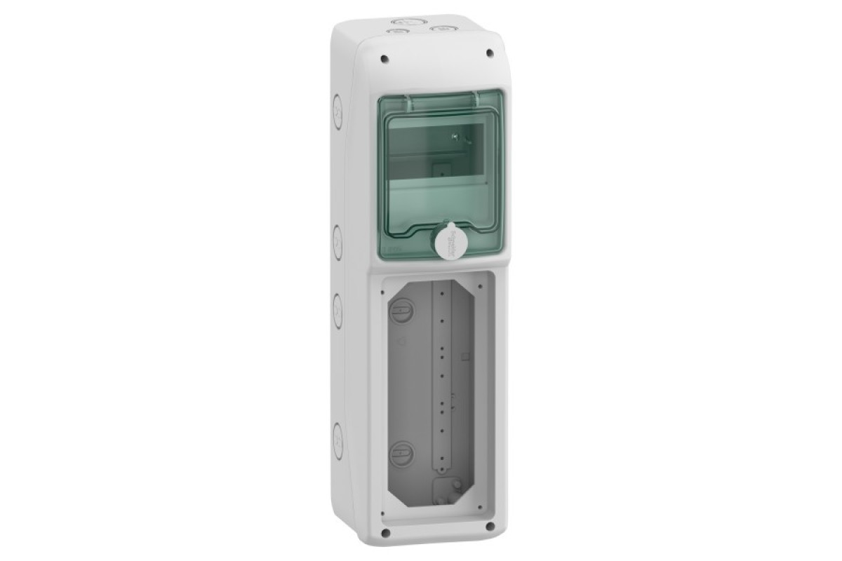 Водонепроникний навісний щит Mureva для встановлення розеток. У ньому можна розмістити всі типи модульних розподільчих пристроїв. Містить зону для встановлення промислових або побутових розеток, кнопок або світлових індикаторів. Щит призначений для внутрішнього або зовнішнього встановлення. У комплект поставки входять прозорі зелені двері для зони встановлення модульного обладнання. Колір світло-сірий (RAL 7035). Кабелі вводяться у верхній частині щита через 3 попередньо підготовлених місця для підведення. Він оснащений задньою пластиною та передньою кришкою з виїмкою. Набір для маркування також постачається в комплекті з виробом. Клас електроізоляції II (подвійна ізоляція). Категорія перенапруги II класу. Розсіювана потужність становить 12 Вт. Номінальний струм In до 63А. Цей виріб відповідає стандартам МЕК 61439-1 і 3, МЕК 60670-1 і 24. Розміри: (Ш) 138 мм x (В) 460 мм x (Г) 160 мм. Вага виробу 1,2 кг. Матеріал являє собою самозатухаючий полімерний матеріал. Його стійкість до полумя та надмірної температури становить 650°C згідно з МЕК 60695-2-1. Він стійкий до ультрафіолету. Ступінь ударозахисту IK09. Робоча температура від -25 до 40 °C.