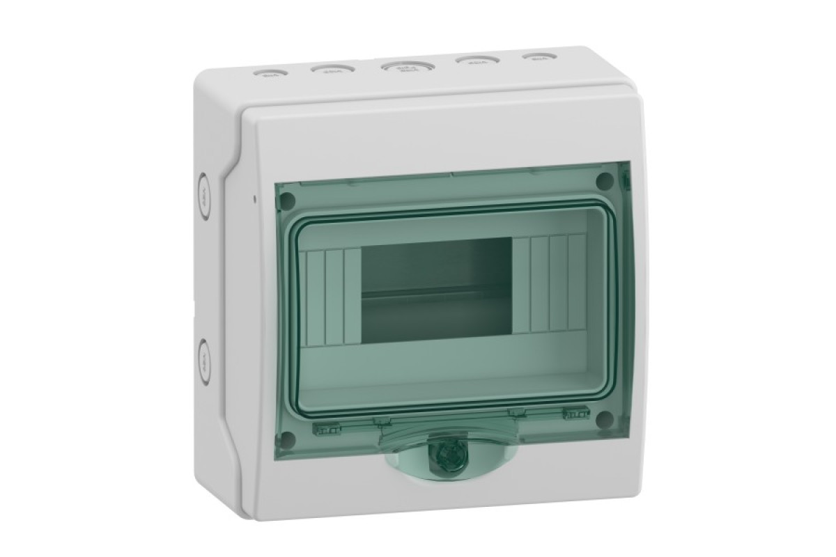 Водонепроникний навісний міні-щит Mureva, для монтажу модульних пристроїв. Щит містить 1 ряд на 8 модулів по 18 мм. Може вмістити всі типи модульних розподільних пристроїв. Щит призначений для внутрішнього та зовнішнього встановлення. Ступінь захисту IP65. Містить прозорі зелені двері. Колір щита світло-сірий (RAL 7035). Призначений для встановлення в житлових будівлях та промисловості. Кабелі можна вводити через верхню або нижню частину щита через 5 підготовлених для вирізу отворів. Оснащений задньою пластиною, кришкою з виїмкою та DIN-рейкою. Набір для маркування входить у комплект поставки. Клас електроізоляції II (подвійна ізоляція). Категорія перенапруги клас II. Розсіювана потужність 15 Вт. Номінальний струм (In) 63А. Продукт повністю відповідає стандарту МЕК 61439-3. Розміри: (Ш) 195 мм x (В) 200 мм x (Г) 112 мм. Виріб зроблено з самозатухаючого полімеру. Стійкість до полумя та надмірної температури становить 650°C згідно з МЕК 60695-2-1. Стійкий до ультрафіолету. Ступінь ударозахисту IK09. Робоча температура від -25°C до 60°C. Робоча температура від -25°C до 60°C.
