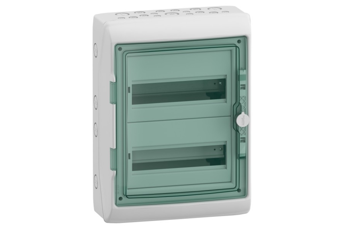 Водонепроникний щит Mureva призначений для встановлення модульного обладнання. Розмір для втановлення модульного обладнання 2 ряди по 12 модулів по 18 мм. Ступінь захисту IP65. Щит призначений для внутрішнього або зовнішнього встановлення. У комплект поставки входять прозорі зелені двері. Колір світло-сірий (RAL 7035). Призначений для встановлення в житлових та невеликих комерційних будівлях і промисловості. Кабелі можна підводити у верхній або нижній частині щита через 17 попередньо підготовлених місць для підведення. Оснащений задньою пластиною, кришкою з виїмкою та DIN-рейкою. Щит постачається з 1 клемним блоком з 32 вихідними клемами (16x10 мм² + 16x16 мм²). Набір для маркування входить у комплект поставки. Клас електроізоляції II (подвійна ізоляція). Категорія перенапруги II класу. Розсіювана потужність становить 34 Вт. Номінальний струм In до 63А. Цей продукт відповідає стандарту МЕК 61439-3. Розміри: (Ш) 340 мм x (В) 460 мм x (Г) 160 мм. Матеріал являє собою самозатухаючий полімерний матеріал. Його стійкість до полумя та надмірної температури становить 650°C згідно з МЕК 60695-2-1. Він стійкий до ультрафіолету. Ступінь ударозахисту IK09. Робоча температура від -25°C до 60°C. Робоча температура від -25°C до 60°C.