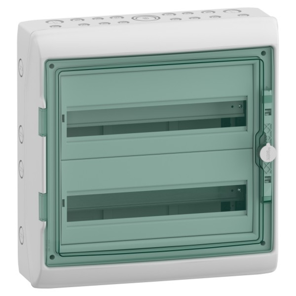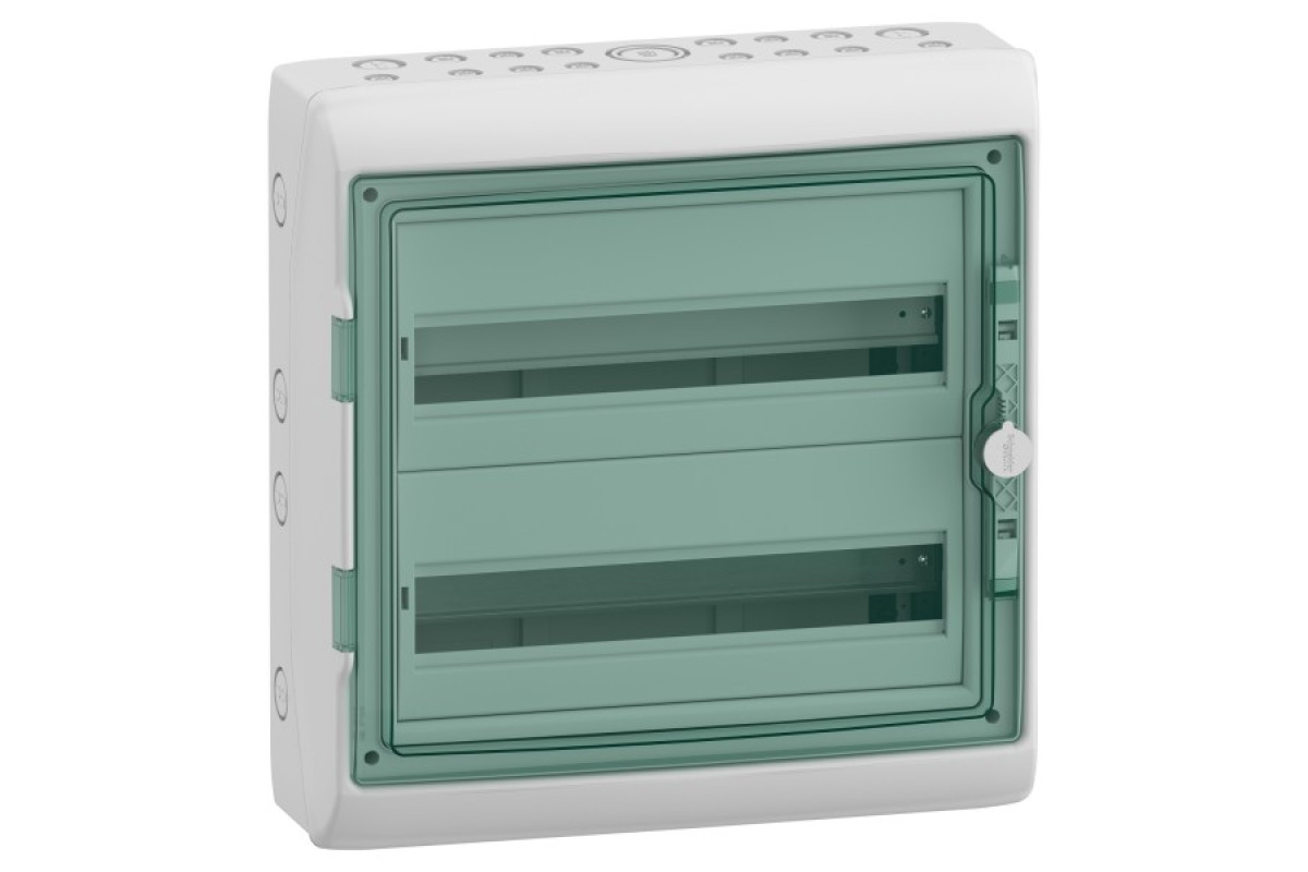 Водонепроникний щит Mureva, розмір щита для втановлення модульного обладнання 2 ряди по 18 модулів, має перекидні прозорі двері. Щит призначений для внутрішнього або зовнішнього встановлення. Розміри щита: (Ш) 448 мм х (В) 460 мм х (Г) 160 мм. Номінальний струм 90А, згідно МЕК 60439-1 має повну ізоляцію класу 2. Ступінь захисту IP65. Ступінь ударозахисту IK09. Колір щита світло-сірий (RAL 7035). Робоча температура від -25°C до 60°C. Щит без встановленого обладнання відповідає стандарту МЕК 60670. Щит з обладнанням відповідає стандарту МЕК 60493-3.
