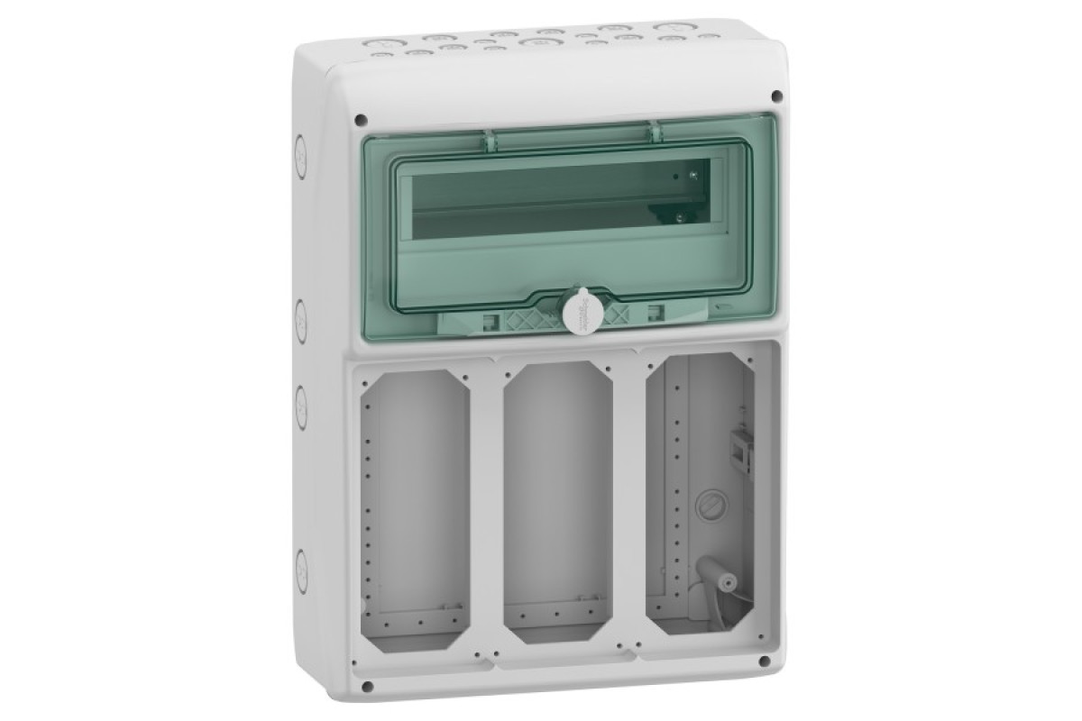 Водонепроникний навісний щит Mureva для встановлення промислових розеток. Розмір щита для втановлення модульного обладнання 1 ряд з 12 модулів по 18 мм. Він може вмістити всі типи модульних розподільчих пристроїв. Щит оснащений 3 пластинами для промислових або побутових розеток, кнопок або світлових індикаторів. Ступінь захисту IP65. Щит призначений для внутрішнього або зовнішнього встановлення. У комплект поставки входять прозорі зелені двері для зони встановлення модульного обладнання. Колір світло-сірий (RAL 7035). Призначений для встановлення в житлових та невеликих комерційних будівлях і промисловості. Кабелі можна підводити у верхній або нижній частині щита через 17 попередньо підготовлених місць для підведення. Він оснащений задньою пластиною та передньою кришкою з виїмкою. Щит оснащений DIN-рейкою, 2 пластинами для розеток 65x65 мм або 75x75 мм. Набір для маркування постачається разом із щитом. Клас електроізоляції II (подвійна ізоляція). Категорія перенапруги II класу. Розсіювана потужність становить 28 Вт. Номінальний струм In до 63А. Цей продукт відповідає стандарту МЕК 61439-3. Розміри: (Ш) 340 мм x (В) 460 мм x (Г) 160 мм. Вага виробу 2,7 кг. Матеріал являє собою самозатухаючий полімерний матеріал. Його стійкість до полумя та надмірної температури становить 650°C згідно з МЕК 60695-2-1. Він стійкий до ультрафіолету. Ступінь ударозахисту IK09.