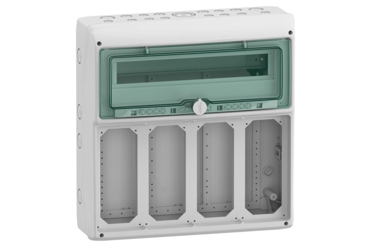 Водонепроникний навісний щит Mureva для встановлення промислових розеток. Розмір щита для втановлення модульного обладнання 1 ряд з 18 модулів по 18 мм. Він може вмістити всі типи модульних розподільчих пристроїв. Щит оснащений 4 пластинами для промислових або побутових розеток, кнопок або світлових індикаторів. Ступінь захисту IP65. Щит призначений для внутрішнього або зовнішнього встановлення. У комплект поставки входять прозорі зелені двері для зони встановлення модульного обладнання. Колір світло-сірий (RAL 7035). Призначений для встановлення в житлових та невеликих комерційних будівлях і промисловості. Кабелі можна підводити у верхній або нижній частині щита через 17 попередньо підготовлених місць для підведення. Він оснащений задньою пластиною та передньою кришкою з виїмкою. Щит оснащений DIN-рейкою, 2 пластинами для розеток 65x65 мм або 75x75 мм. Набір для маркування постачається разом із щитом. Клас електроізоляції II (подвійна ізоляція). Категорія перенапруги II класу. Розсіювана потужність становить 39 Вт. Номінальний струм In до 90А. Цей продукт відповідає стандарту МЕК 61439-3. Розміри: (Ш) 448 мм x (В) 460 мм x (Г) 160 мм. Вага виробу 3,2 кг. Матеріал являє собою самозатухаючий полімерний матеріал. Його стійкість до полумя та надмірної температури становить 650°C згідно з МЕК 60695-2-1. Він стійкий до ультрафіолету. Ступінь ударозахисту IK09.