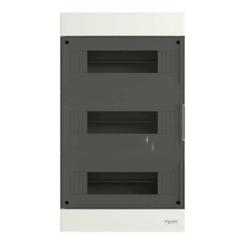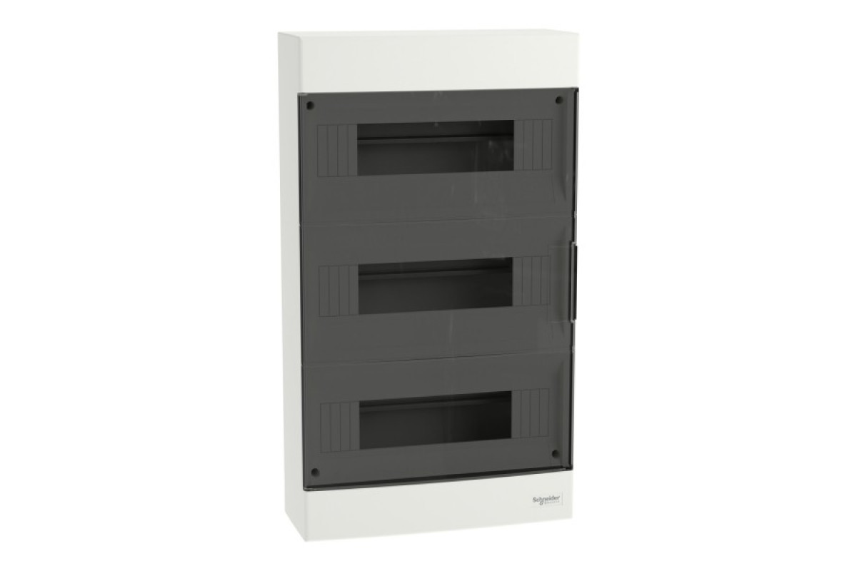 Щит Easy9 EU це навісний розподільчий щит для модульного обладнання. Він розміром 3 ряди по 12 модулів по 18 мм та в нього може бути встановлено будь-яке модульне обладнання. Щит поставляється разом з клемниками земля та нейтраль, та їх кріпленням. Кожен клемник має 22 клеми підключення (11x16мм² + 11x10мм²). Він поставляється з димчастими дверима, які переставляються та відкриваються на кут 180°. Колір щита - білий (RAL 9003). Щит призначений для встановлення в приміщенні. Ступінь захисту IP40 з закритими і IP30 з відкритими дверима. Щит не має кабельних вводів, їх необхідно робити за допомогою дрилю. Він призначений для нового встановлення або заміни існуючого щита в житлових та малих комерційних будівлях. Його номінальний струм In 80 А. Номінальна напруга ізоляції Ui - 500 В. Номінальна робоча напруга Ue - 400 В. Внутрішня комплектація щита: зйомне шассі з DIN-рейкою, пластрон. Розміри: (Ш) 256 мм x (В) 451 мм x (D) 103 мм. Ширина 72 модулів по 9 мм. Вага виробу - 1,70 кг. Щит виготовлено з самозатухаючого пластику. Його стійкість до вогню та надмірної температури становить 650°C протягом 30 хв. Клас електроізоляції ІІ (подвійна ізоляція). Ступінь забруднення 2. Відповідно до стандарту МЕК 62262 ступінь ударозахисту IK07. Робоча температура від -25°C до +60°C. Температура зберігання від -25°С до +70°С. Даний щит відповідає стандарту МЕК 60670-1-24.