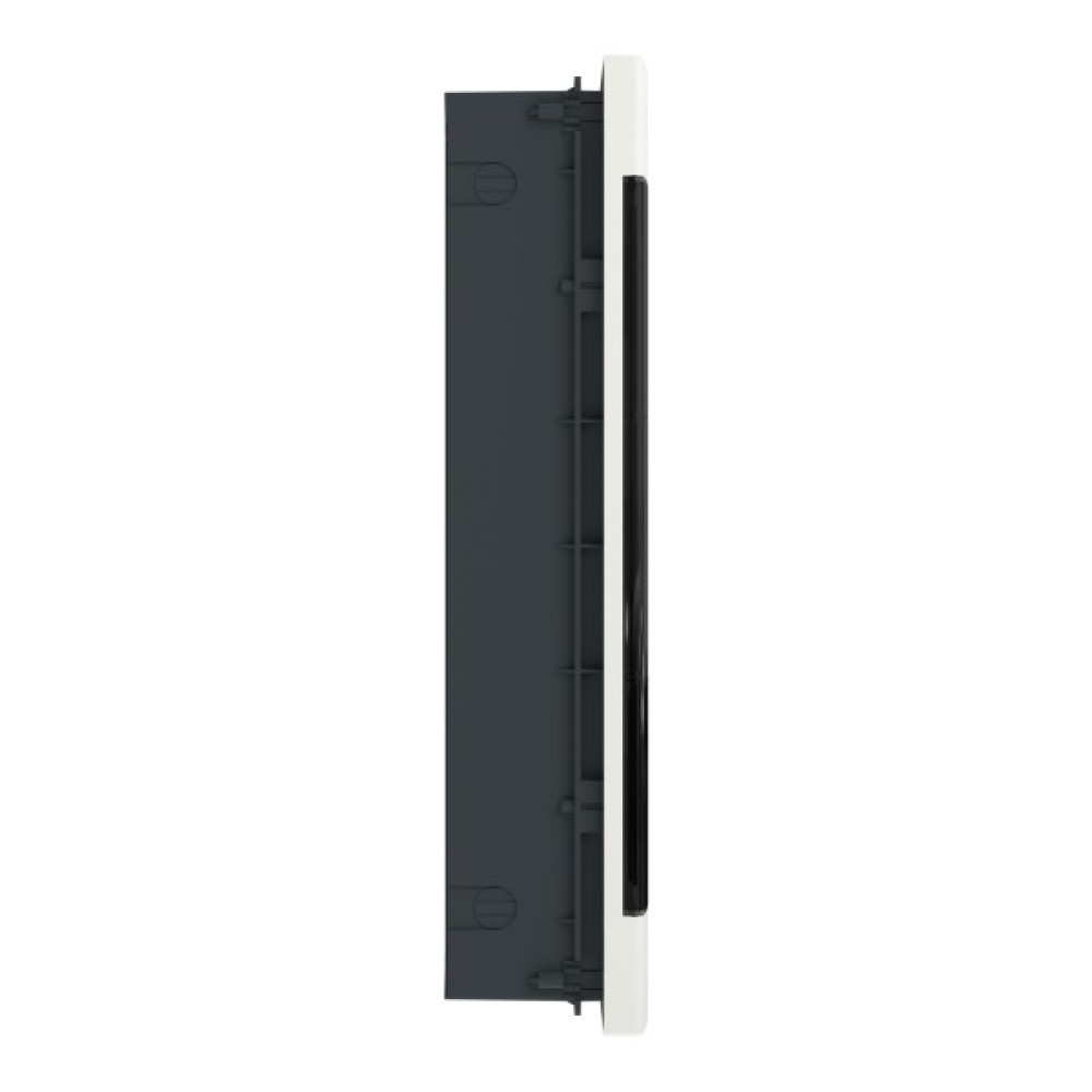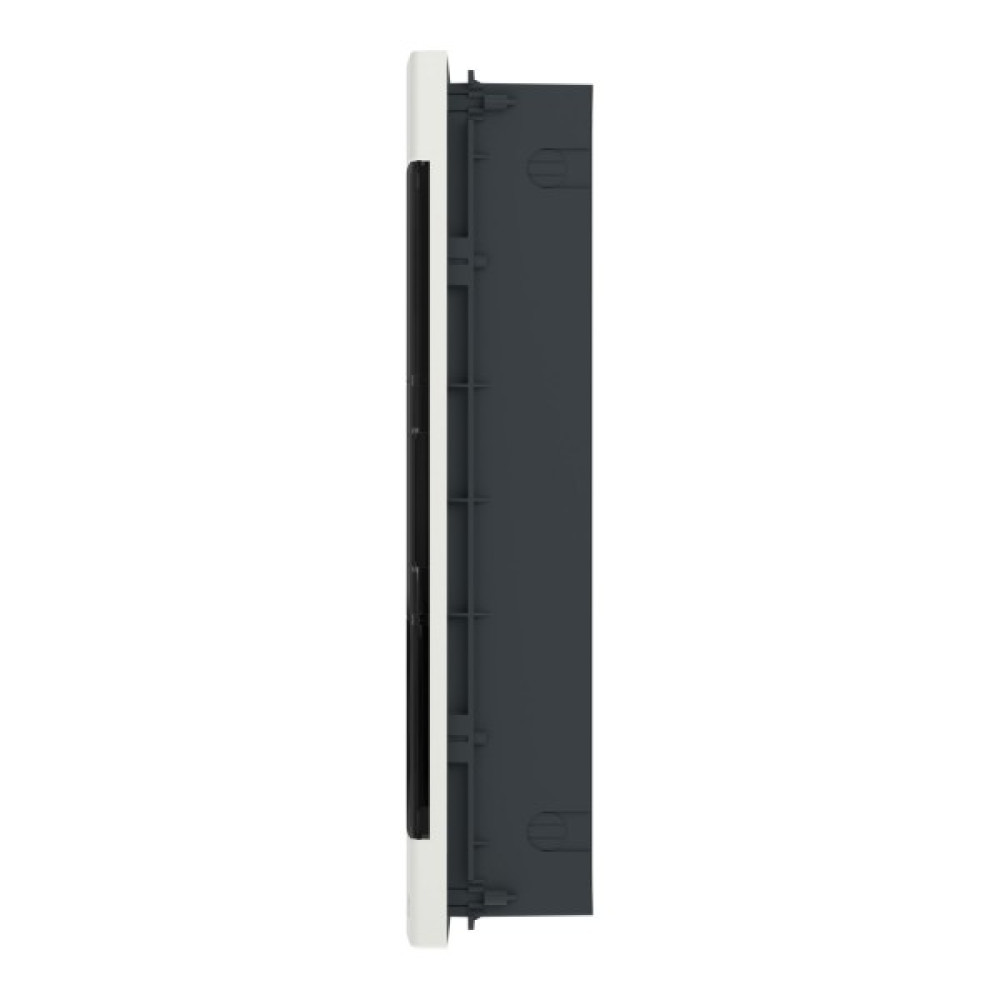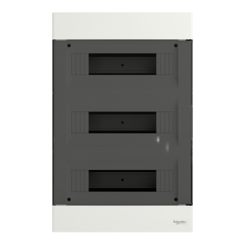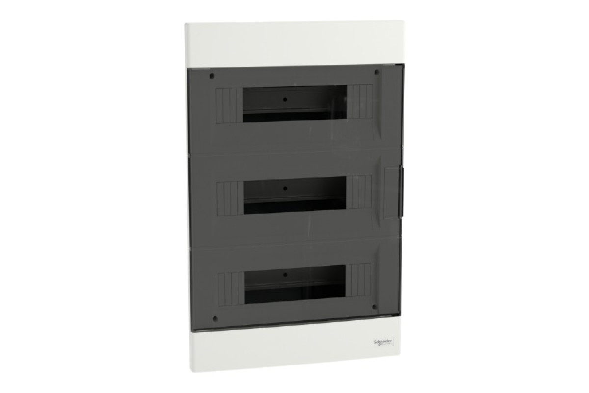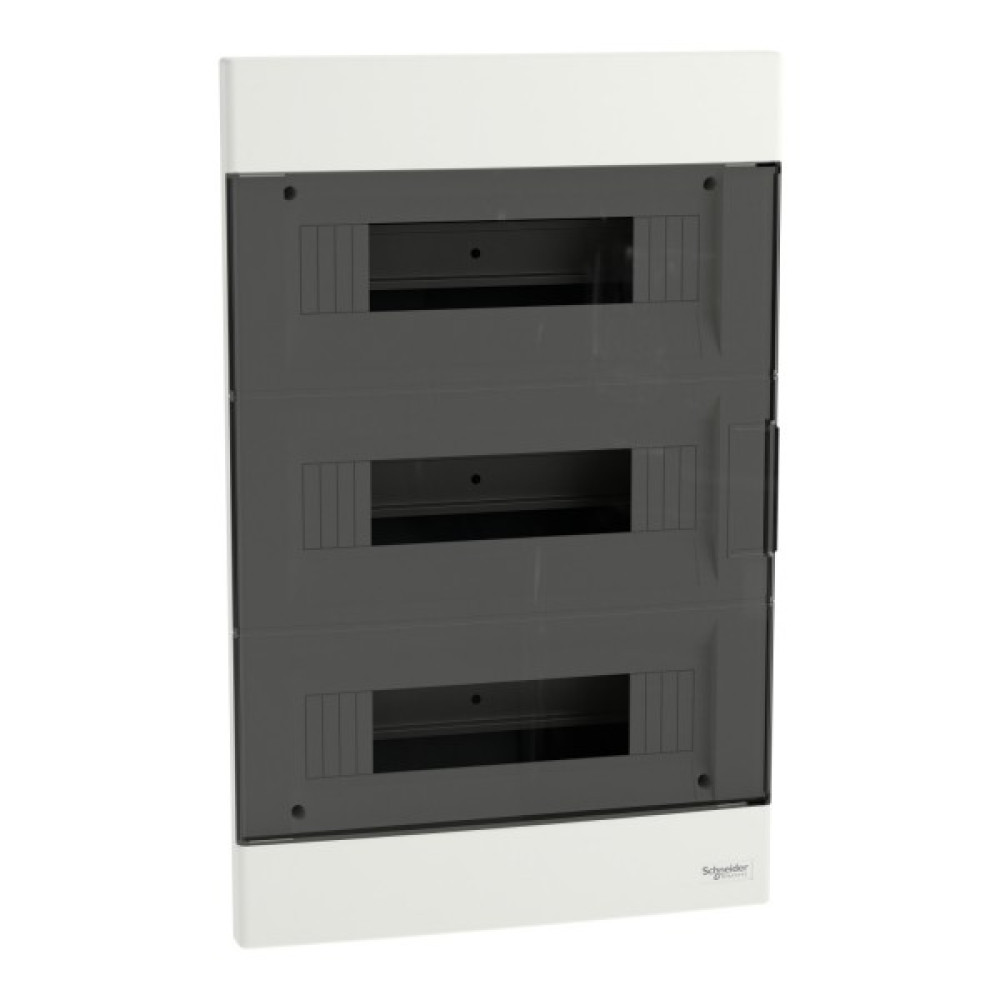 Щит Easy9 EU це врізний розподільчий щит для модульного обладнання. Він розміром 3 ряди по 12 модулів по 18 мм та в нього може бути встановлено будь-яке модульне обладнання. Щит поставляється разом з клемниками земля та нейтраль, та їх кріпленням. Кожен клемник має 22 клеми підключення (11x16мм² + 11x10мм²). Він поставляється з димчастими дверима, які переставляються та відкриваються на кут 180°. Колір щита - білий (RAL 9003). Щит призначений для встановлення в приміщенні. Ступінь захисту IP40 з закритими і IP30 з відкритими дверима. Підведення кабелю можливо здійснити з 4 сторін щита через кабельні вводи. Він призначений для нового встановлення або заміни існуючого щита в житлових та малих комерційних будівлях. Його номінальний струм In 80 А. Номінальна напруга ізоляції Ui - 500 В. Номінальна робоча напруга Ue - 400 В. Внутрішня комплектація щита: захисний картон, зйомне шассі з DIN-рейкою, пластрон. Розміри: (Ш) 300 мм x (В) 470 мм x (Г) 99 мм. Ширина 72 модулів по 9 мм. Вага виробу - 1,85 кг. Щит виготовлено з самозатухаючого пластику. Його стійкість до вогню та надмірної температури становить 650°C протягом 30 хв. Клас електроізоляції ІІ (подвійна ізоляція). Ступінь забруднення 2. Відповідно до стандарту МЕК 62262 ступінь ударозахисту IK07. Робоча температура від -25°C до +60°C. Температура зберігання від -25°С до +70°С. Даний щит відповідає стандарту МЕК 60670-1-24.