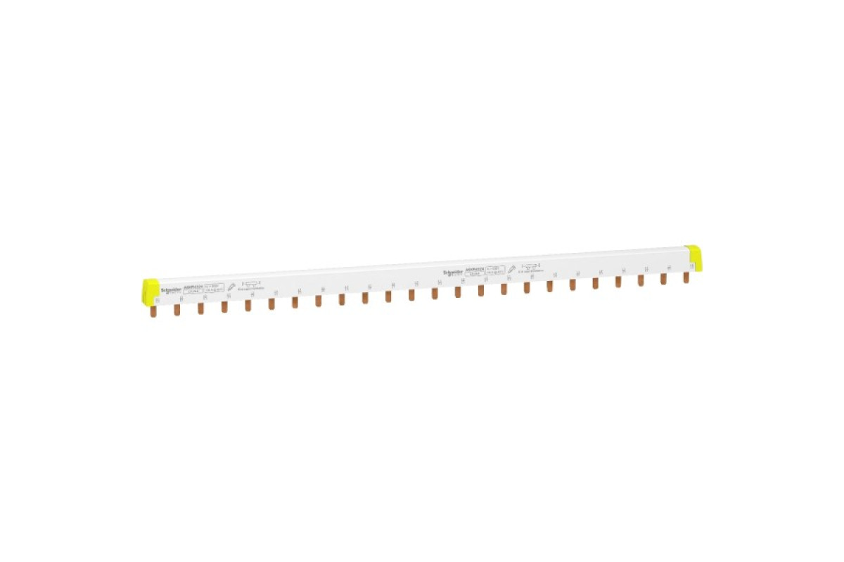 Горизонтальна гребінчаста шинка Acti9 на 24 модулі призначена для модульного облданання серій Acti9 iC60 або iK60. Призначена для використання разом з 3P модульним обладнанням, конфігурація шинки: L1 L2 L3. До неї можна підключити 8 пристроїв з конфігурацією полюсів 3P. Довжина 430 мм. Загальна кількість модулів 24 по 18 мм. Площа поперечного перерізу 1 піна шинки 16 мм2. Тип електричного підключення PIN. Кількість фаз – 3. Кількість полюсів – 3.